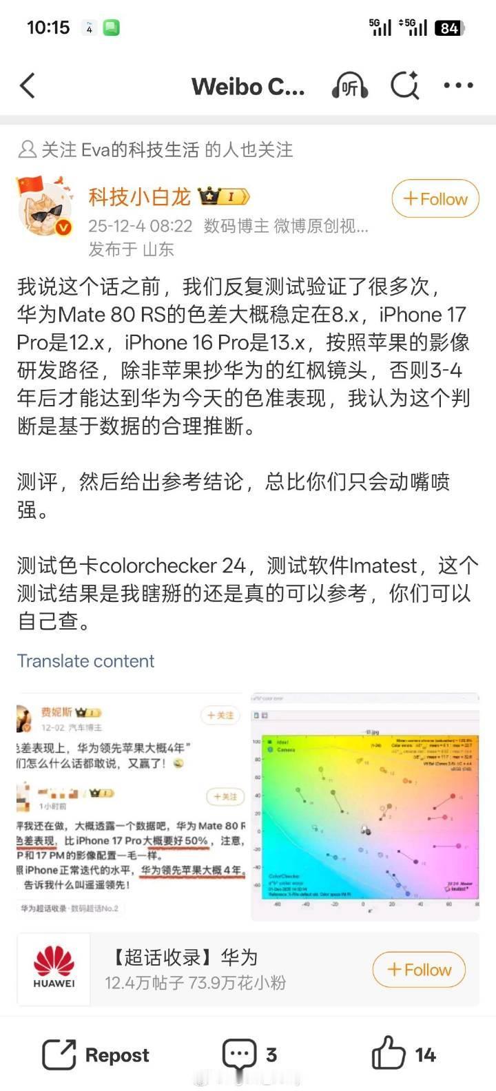 《色差表现上,华为领先苹果大概4年》这件事本来不想回应的,想想还是出来说几句吧。1,领先大概50%,这个50%不会是(12-8)/8得出来的吧,算都不会算确实挺业余。2,拿16和17的迭代差来代表苹果的迭代水平,这算是一种精神胜利法吗?3,数据这种东西看看就行了,不服跑个分已经成为过去式,以实际体验为主。