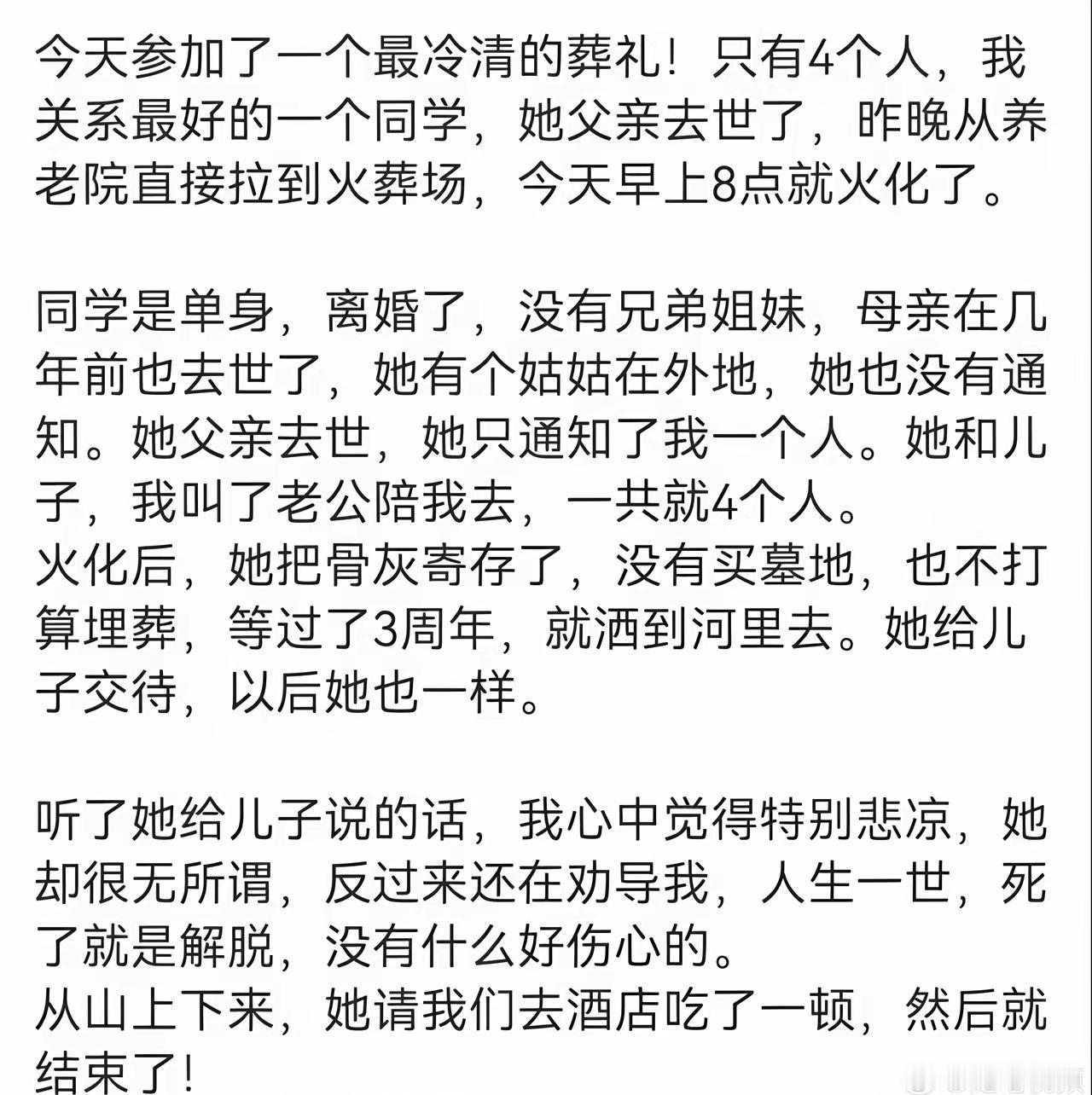 这还可以了,最起码是子女全程办理,以后那么多丁克和单身,去世以后,估计连个仪式都没有,工作人员草草了事!