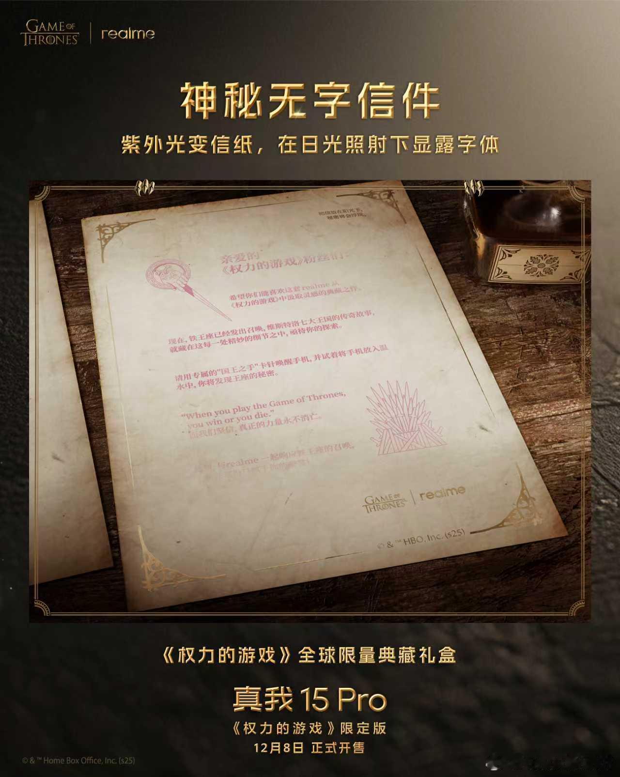 真我15 Pro《权力的游戏》全球限量典藏礼盒公布,匠心独运打造定制精品!-“国王之手”卡针:定制珍藏卡针,致敬提利昂·兰尼斯特,享受御前首相身份的定制体验;-神秘无字信纸:紫外光变信纸,在日照下显露隐藏字迹,致敬梅丽珊卓的火魔法;-精美定制周边:内含专属家族徽章贴纸和典藏级角色明信片,精美兼具实用;真我15Pro权力的游戏限定版 将于12月8日正式开售,惊喜不止于此。