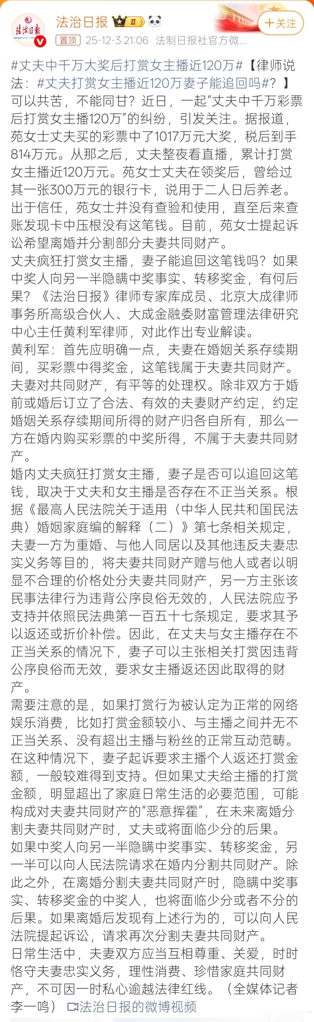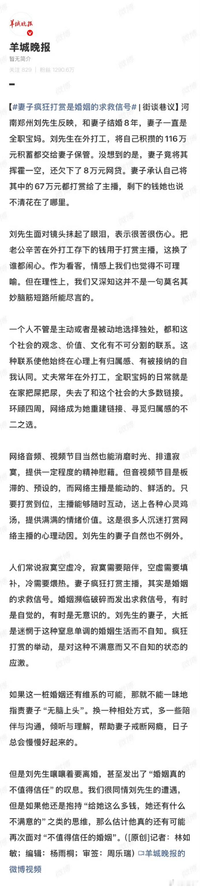 这种事情还用得着讨论?羊城晚报早有预言:丈夫打赏女主播是婚姻的求救信号。丈夫中千万大奖后打赏女主播近120万