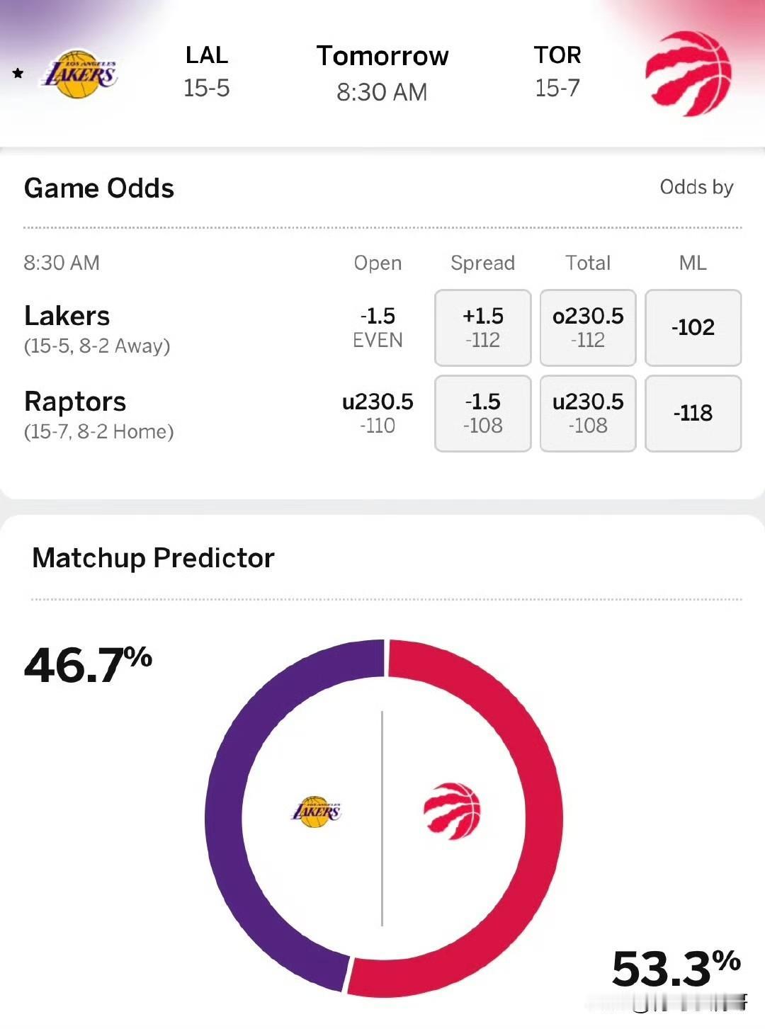 湖人vs猛龙比赛预告!!!湖人对阵猛龙比赛预测,湖人被看衰! 北京时间12月5日,湖人来到了寒冷的多伦多挑战猛龙队,目前湖人排名西部第二,猛龙东部第二,这也算是东西部的强强对话了吧,一起来看下比赛预告吧! 湖人伤病情况: 东契奇个人原因缺阵,斯玛特背部伤病比较严重,继续缺阵。 猛龙伤病情况: 巴雷特和珀尔特尔都打不了,而劳森则是每日观察阶段。 目前ESPN给出的预测结果看,湖人以不足五成的胜率被看衰,猛龙是更被看好的一方,毕竟湖人少了东契奇,他们缺少了一个场均30+的得分手,谁能替代他呢? 不过猛龙的珀尔特尔和巴雷特不打,那么他们的防守也会降了不少,因此猛龙主场也只有-1.5,双方差距并不大,还是要看临场发挥。 湖人 nba 湖人 湖人赛程 湖人比赛 猛龙 东契奇