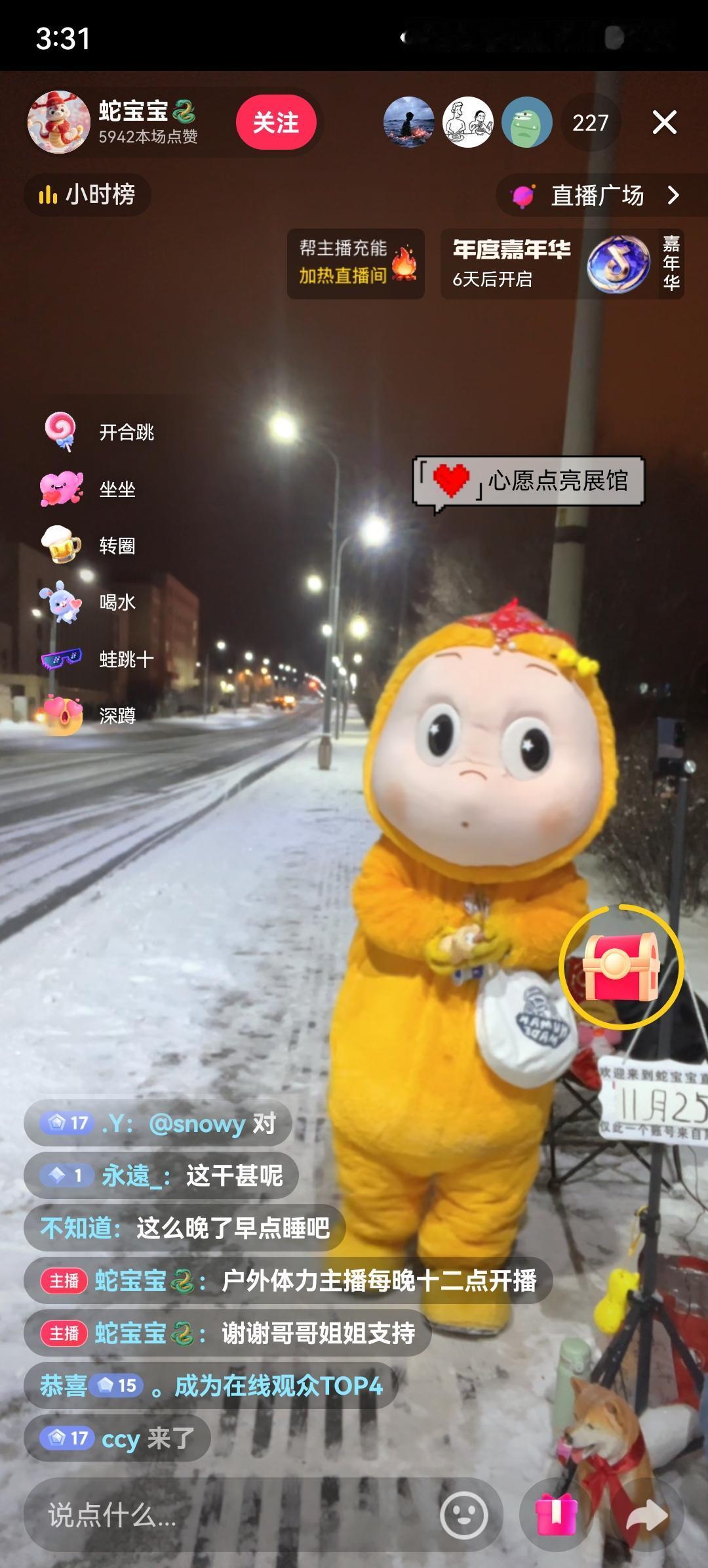 半夜3:30。 醒了,点开手机。 看到一个“蛇宝宝”。 这是2025年哈尔滨冰雪大世界的吉祥物。 而此时直播地点正是零下12度的哈尔滨的一条街道。 “蛇宝宝”的直播很简单,主要是转圈和鞠躬。 但是看了让人有点心酸。 看她的直播介绍,应该是每晚凌晨12点开始直播。 这个时间这么冷的天,谁都想在温暖的被窝里好好睡一觉。 个人介绍只有四个字“单亲妈妈”。 感觉年龄不是太大,不知道这背后有什么故事。应该是因为少不更事吧。 一时不知道该说什么。 希望每个人的人生中都能少踩坑。 如果可以的话尽量不要让自己活得那么心酸。 也不要把自己活成一个悲剧的童话故事。 人生虽然不容易,但终究有很大部分还是可以自己选择的。