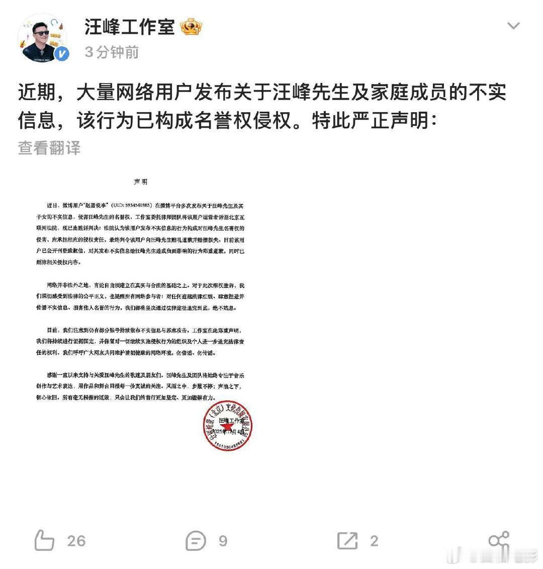 汪峰告黑胜诉汪峰告黑胜诉声明12月4日,发文:近期,大量网络用户发布关于汪峰先生及家庭成员的不实信息,该行为已构成名誉权侵权。特此严正声明。
