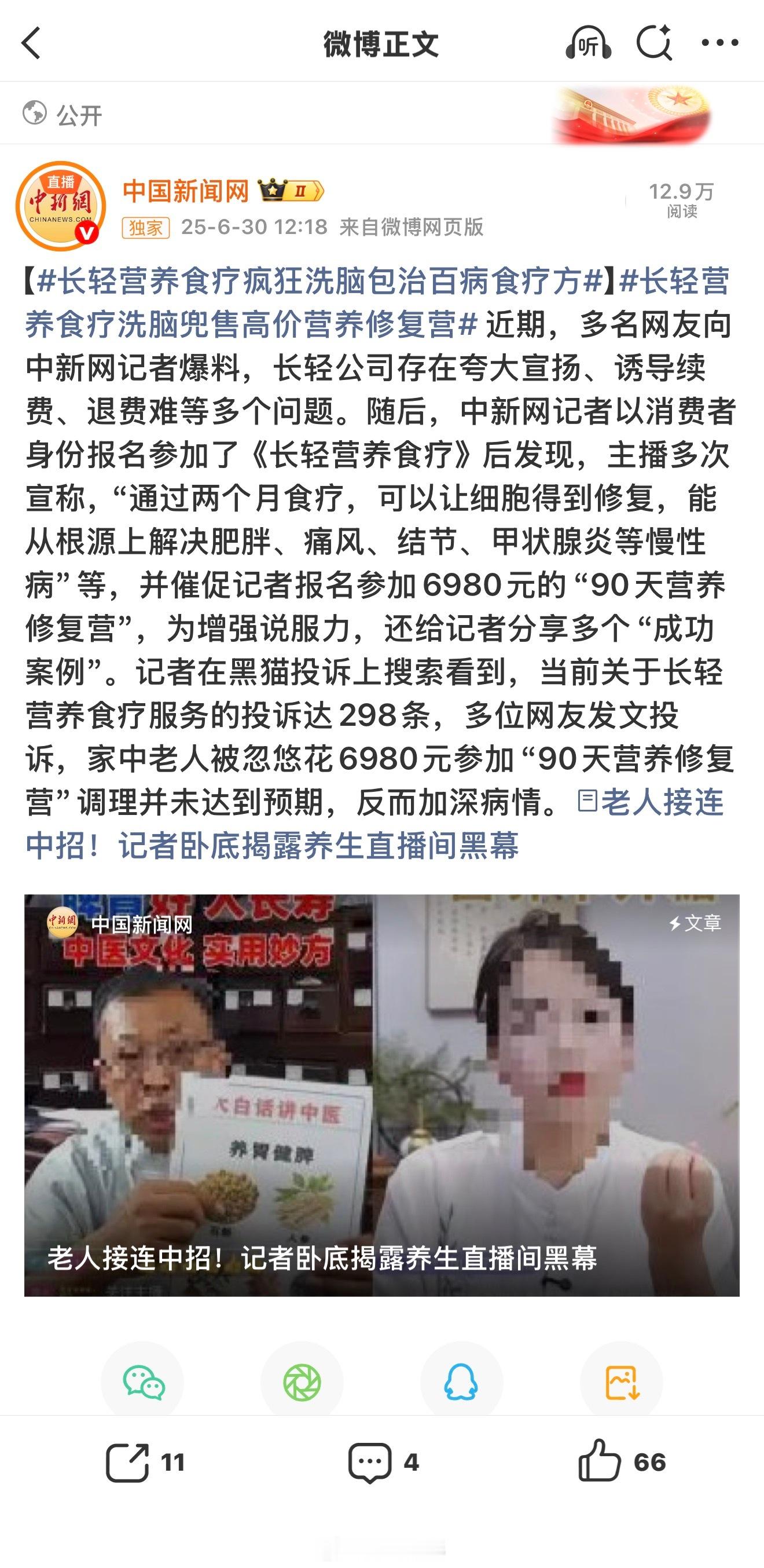 中招了。我就说这两个月老人找各种理由找我要钱,结果是遭了这家的道。一查老人的账单,已经在所谓“营养师”的忽悠下,几个月内背着我花光我给她的钱不说,还刷了信用卡,消费额度超过上万元。(具体花了多少她不让我看,只知道上万,而且付款过的那些小店都已经因为违规而被下架)买来了什么东西?什么驼奶粉,以及各种所谓“食疗教程”。再一查这家“长轻营养食疗科技有限公司”,不得了,已经被中国新闻网,央广网,光明网报道过其虚假营销,诓骗老年人高价消费所谓“食疗指导”的案例,报道称:【记者深入采访发现,大量老年人陷入长轻公司的营销陷阱。黑猫投诉平台针对该公司的投诉案例多达2000余条,涉及虚假宣传、诱导消费、身体损伤、退费难等问题。】基本手法,就是利用老年人怕生病,怕住院,想要健康长寿的心里,让一群培训几天的“营养师”用各种提前准备好的话术,兜售所谓“成功案例”来进行洗脑,除了兜售高价“食疗课程”,还高价出售果蔬生鲜、肉禽蛋品,以及各种来路不明的保健产品。具体报道看图7,上当的老人基本都是几千几万的花钱,不但原本的病没治好,反而雪上加霜。刚才看了下我家老太太买的“课程”,居然是教她每餐吃一些非常清淡的蔬菜,我家老人本来就瘦,长期这样下去迟早营养不良!没病也吃出病来!而现在我遇到的情况跟报道里说的非常相似,老人在我发现问题后,表现得非常抵抗,坚持认为这家公司的“专家”是为她好,她按照他们的“课程”吃了之后“感觉好多了”,“以后也不会生病住院了”。想尽办法维护,连更具体的消费项目都不让我看。行吧,这事儿消费金额上万了,我先找各种渠道投诉,包括报警,如此丧尽天良专挑老人下手,今天既然载到我手上,我就想试试举报这么家投诉满天飞,被多次曝光的诈骗企业有多难。