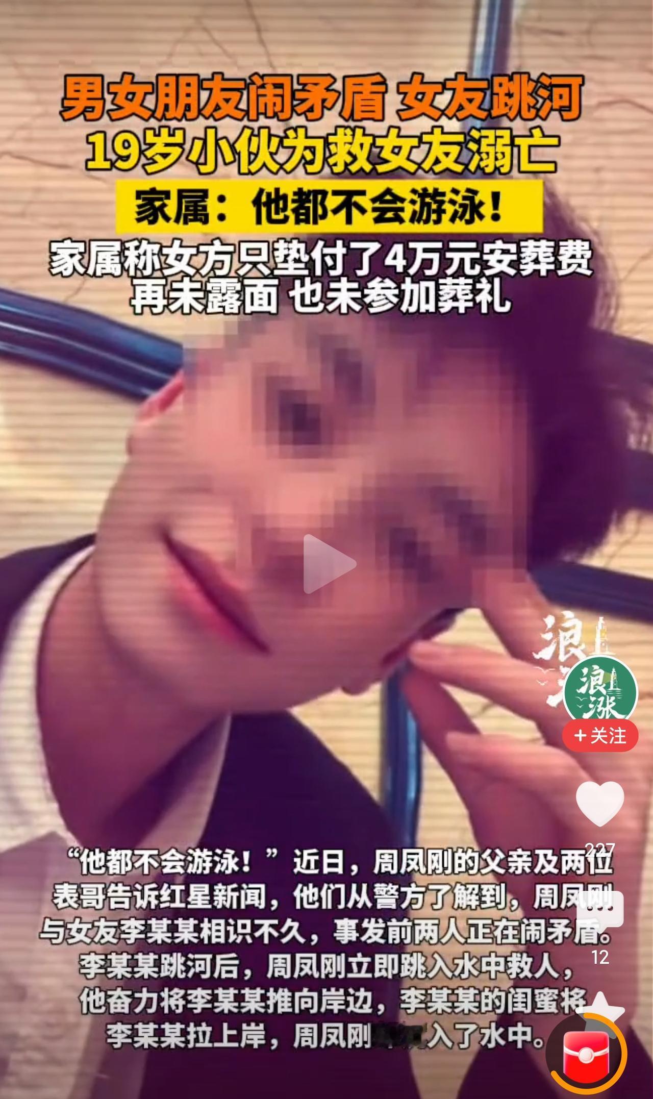 19岁小伙不会游泳,却为救跳河女友溺亡,女方仅垫付4万安葬费 四川西昌海河的冬夜,藏着一场让人揪心的悲剧。19岁的周凤刚,用生命完成了对女友的最后守护——明知自己不会游泳,却在女友跳河后毫不犹豫纵身一跃,把人推上岸的瞬间,自己却沉入了冰冷的河水,永远没能回来。 据家属透露,周凤刚和女友认识才几个月,事发前正闹矛盾。11月21日凌晨,女友酒后多次邀约他见面,他起初拒绝,架不住反复劝说还是赴约了。没想到见面后矛盾没化解,女友竟真的兑现了“你不理我就跳河”的说法,从河边护栏处跳了下去。 没多想,周凤刚脱了外衣就跳下去救人。他拼尽全力把女友往岸边推,女友的闺蜜及时伸手拉人,可等把人救上来,回头再找周凤刚时,水面早已没了他的身影。警方调查后排除了刑事案件,死亡证明显示他是溺水导致呼吸衰竭。 “孩子太傻了,他根本不会游泳啊!”周凤刚的表哥满是惋惜,说他性格内向还孝顺,家里是组合家庭,条件不算好,从没把女友带回家过。如今人没了,家人悲痛到整夜难眠,17岁的妹妹在社交平台发文悼兄:“余生再无你,我的哥哥!” 经调解,女方家属垫付了4万多安葬费,周凤刚已经下葬,但女方之后再没露面,也没参加葬礼。至于要不要起诉索赔,家人说现在没心思考虑,得等情绪平复了再说。 有律师科普,男女朋友在法律上没有法定救助义务,但周凤刚是为了保护女友才遇难,家属有权向女方主张适当补偿。 网友们看了都破防了:“少年的爱太纯粹,可也太傻了,不会游泳真的不能贸然下水!”“见义勇为也要先保自己,找竹竿、喊人都比跳下去强啊!” 一场争吵,一条生命,留下的是破碎的家庭和无尽的遗憾。希望所有人都能记住:善意值得敬佩,但科学施救才是对自己和家人负责! 家长怎样教育好青春期的孩子你会因为感情问题跳河吗 水库有人跳河怎么办? 你认为属于你的幸福是什么
