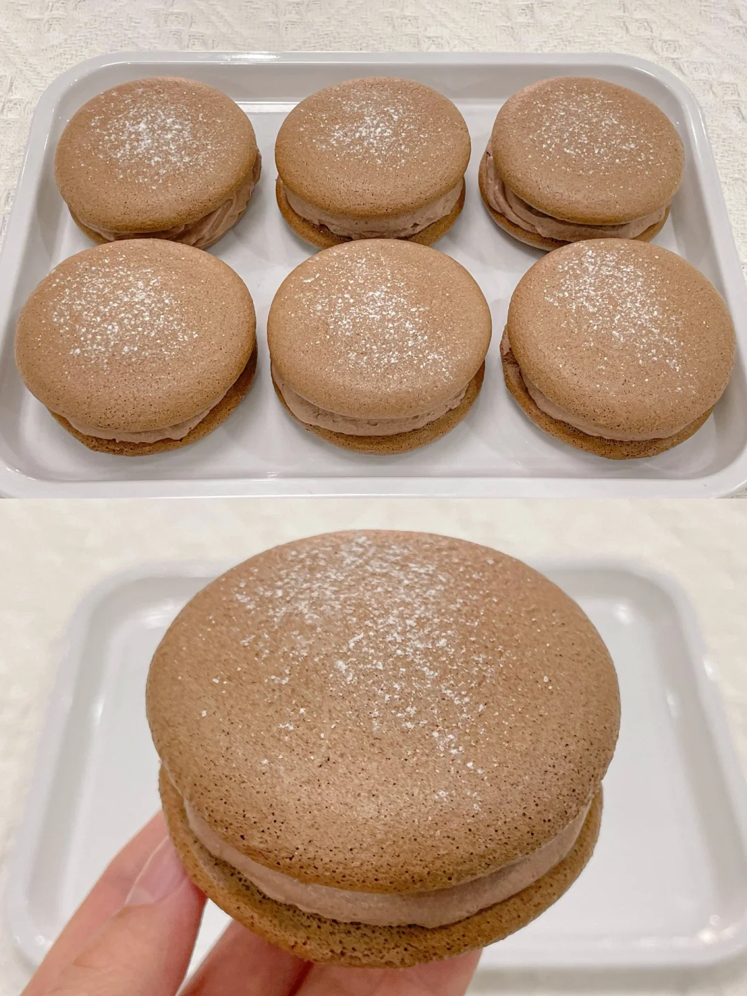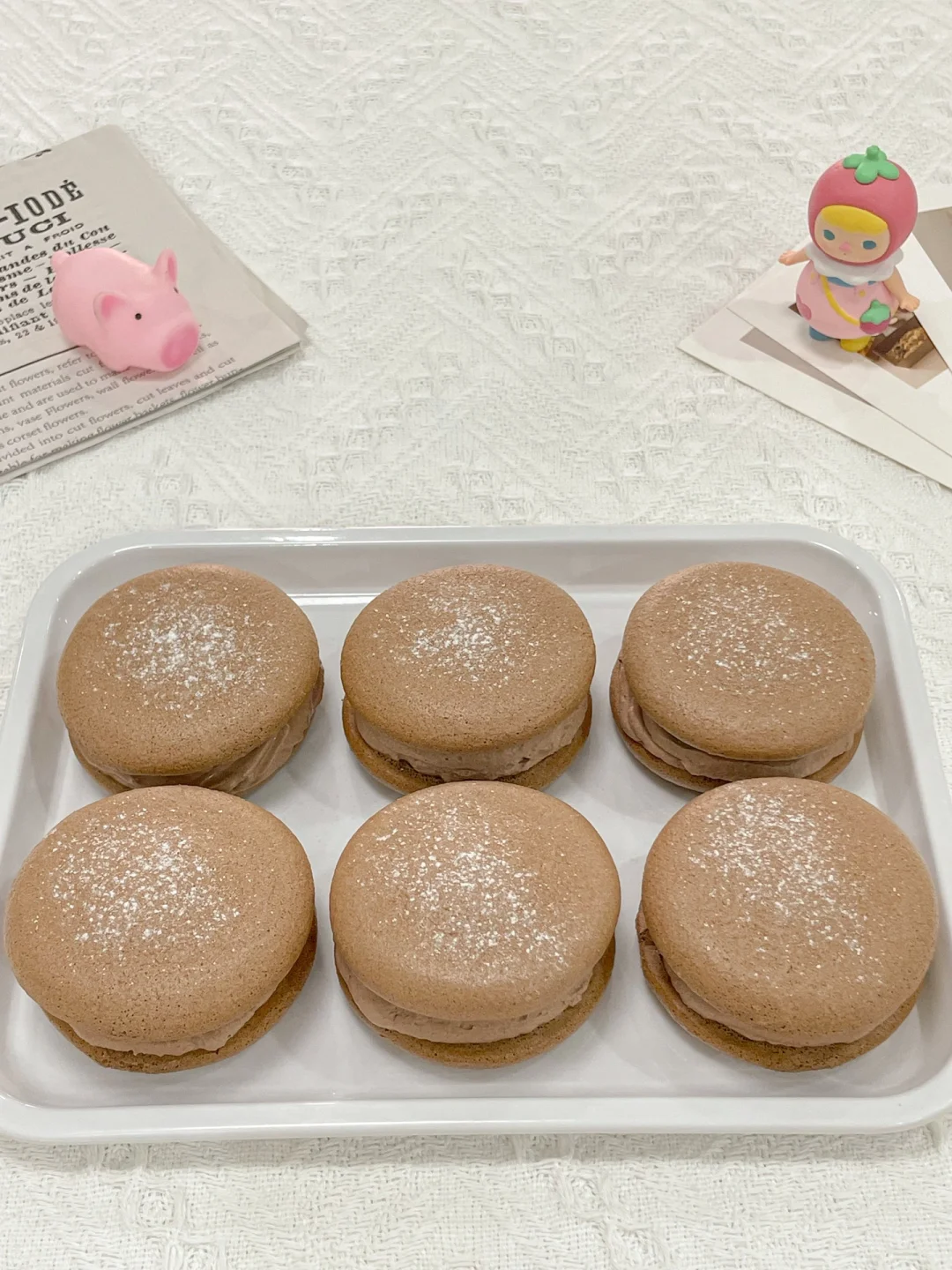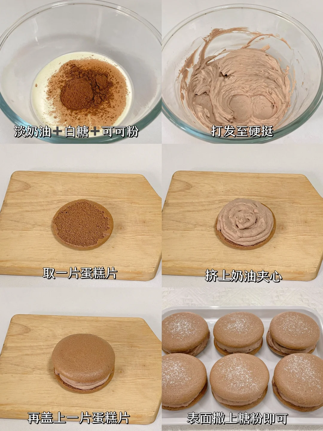 4⃣️淡奶油+白糖+可可粉打发至硬挺,装入裱花袋,一片蛋糕片挤上奶油夹心,再盖上一片蛋糕片,表面撒上糖粉即可开吃。