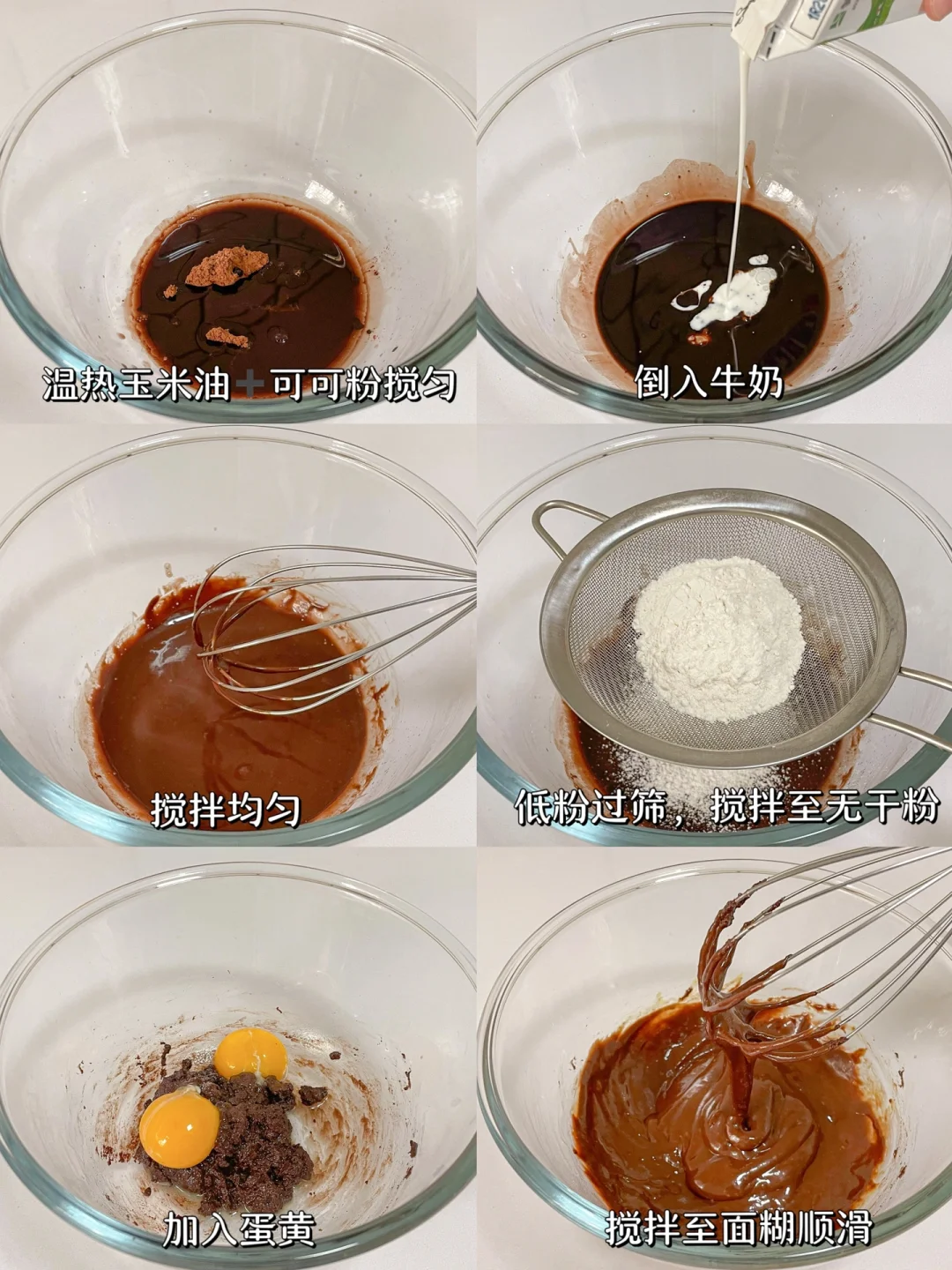 1⃣️温热玉米油+可可粉搅匀,倒入牛奶搅拌均匀,低筋面粉过筛搅拌至无干粉,加入蛋黄搅拌至面糊顺滑。