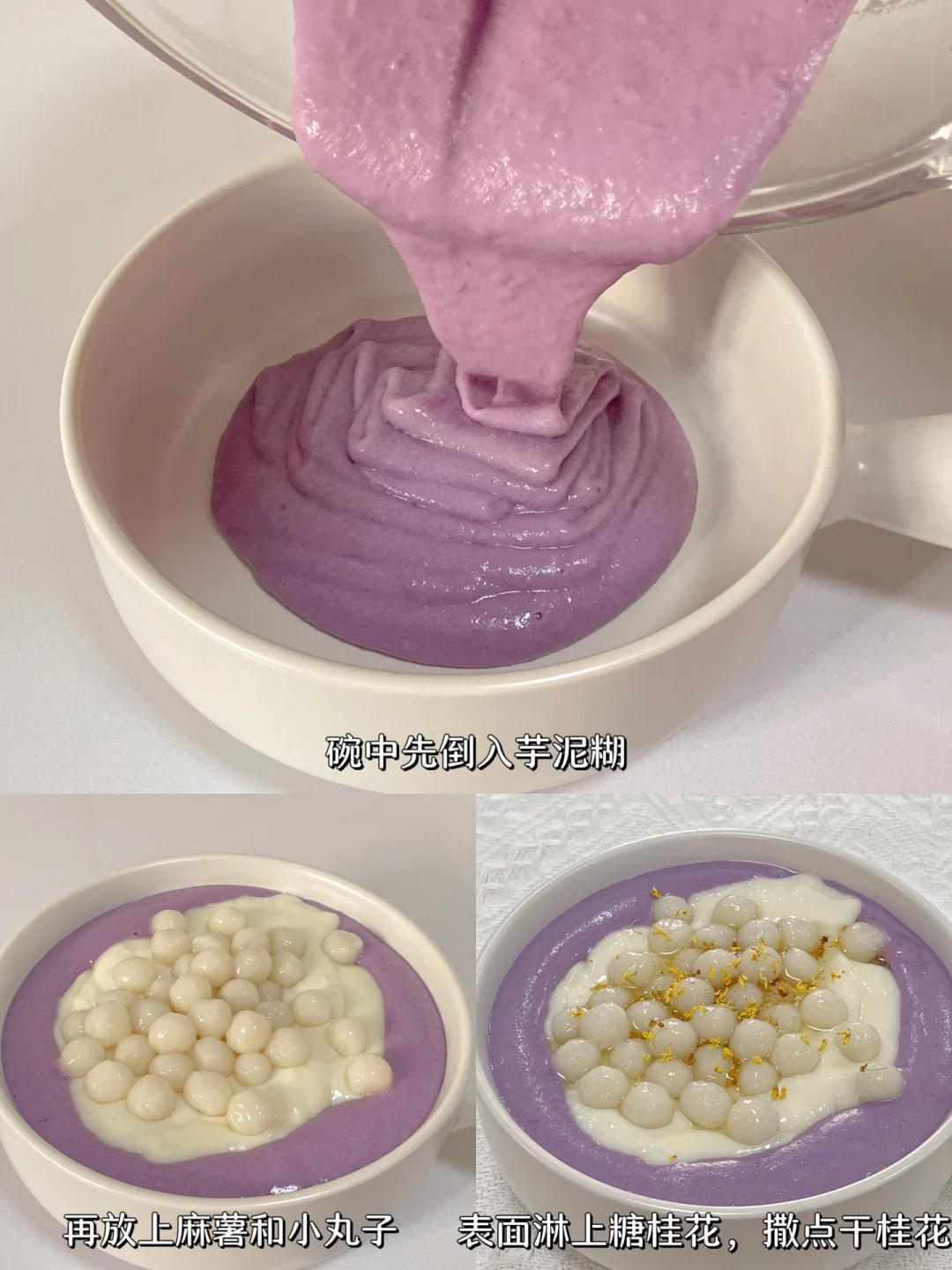 4⃣️碗中先倒入芋泥糊,再放上麻薯和小丸子,表面淋上糖桂花和撒上干桂花即可开吃。