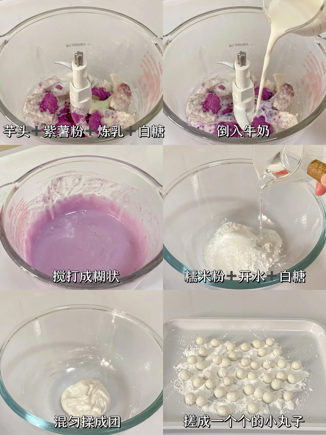 1⃣️芋头提前上锅蒸熟,芋头+紫薯粉+炼乳+白糖+牛奶搅打成糊状。