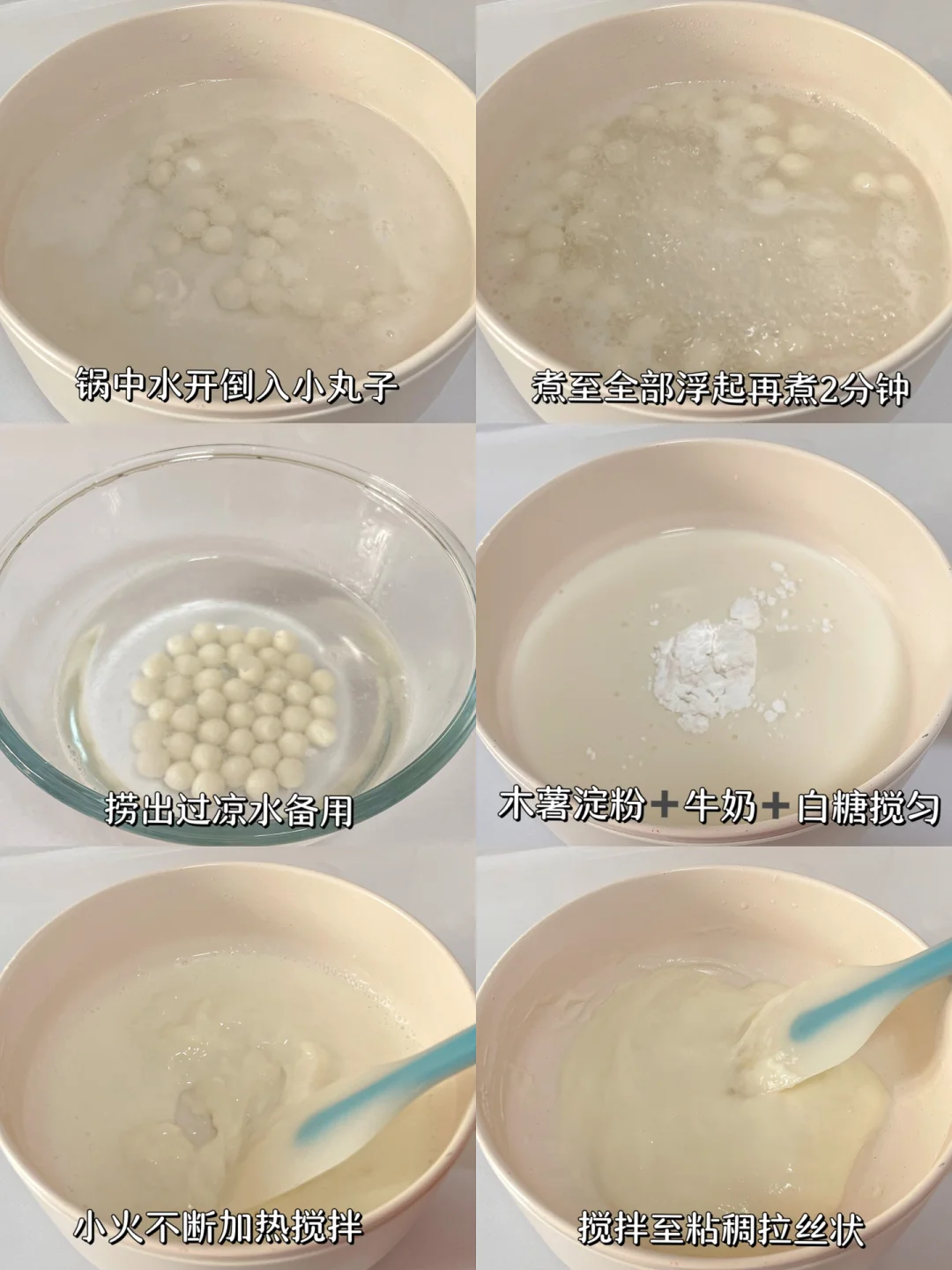 3⃣️锅中倒入木薯淀粉+牛奶+白糖搅匀,再开小火不断加热搅拌,搅拌至粘稠拉丝状即可。