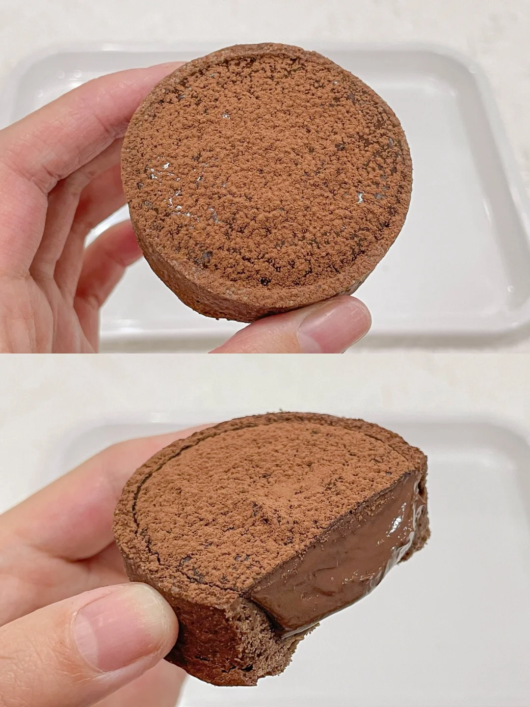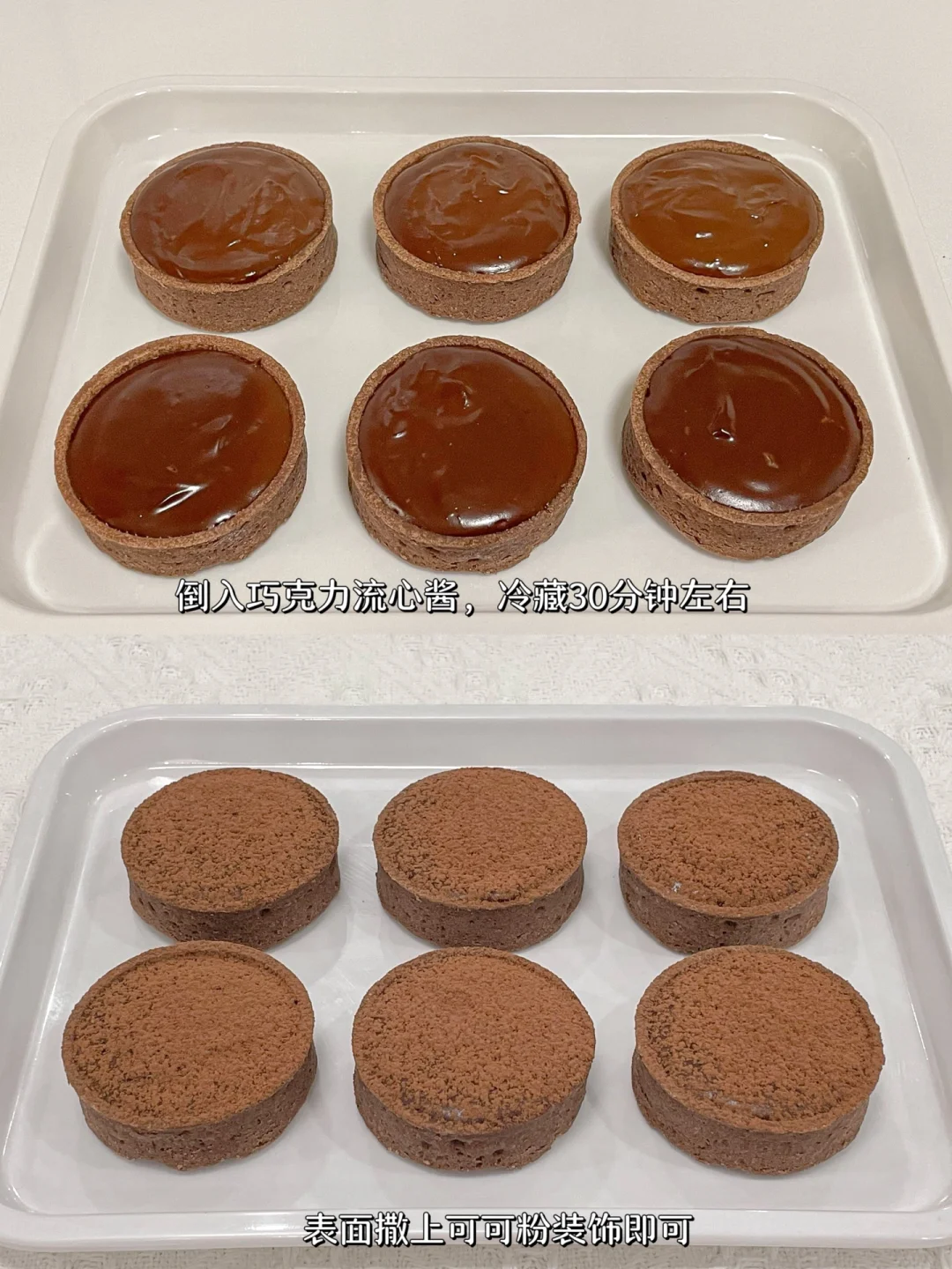 3⃣️倒入巧克力流心酱至挞壳中,冷藏30分钟左右,最后撒上可可粉装饰一下即可。