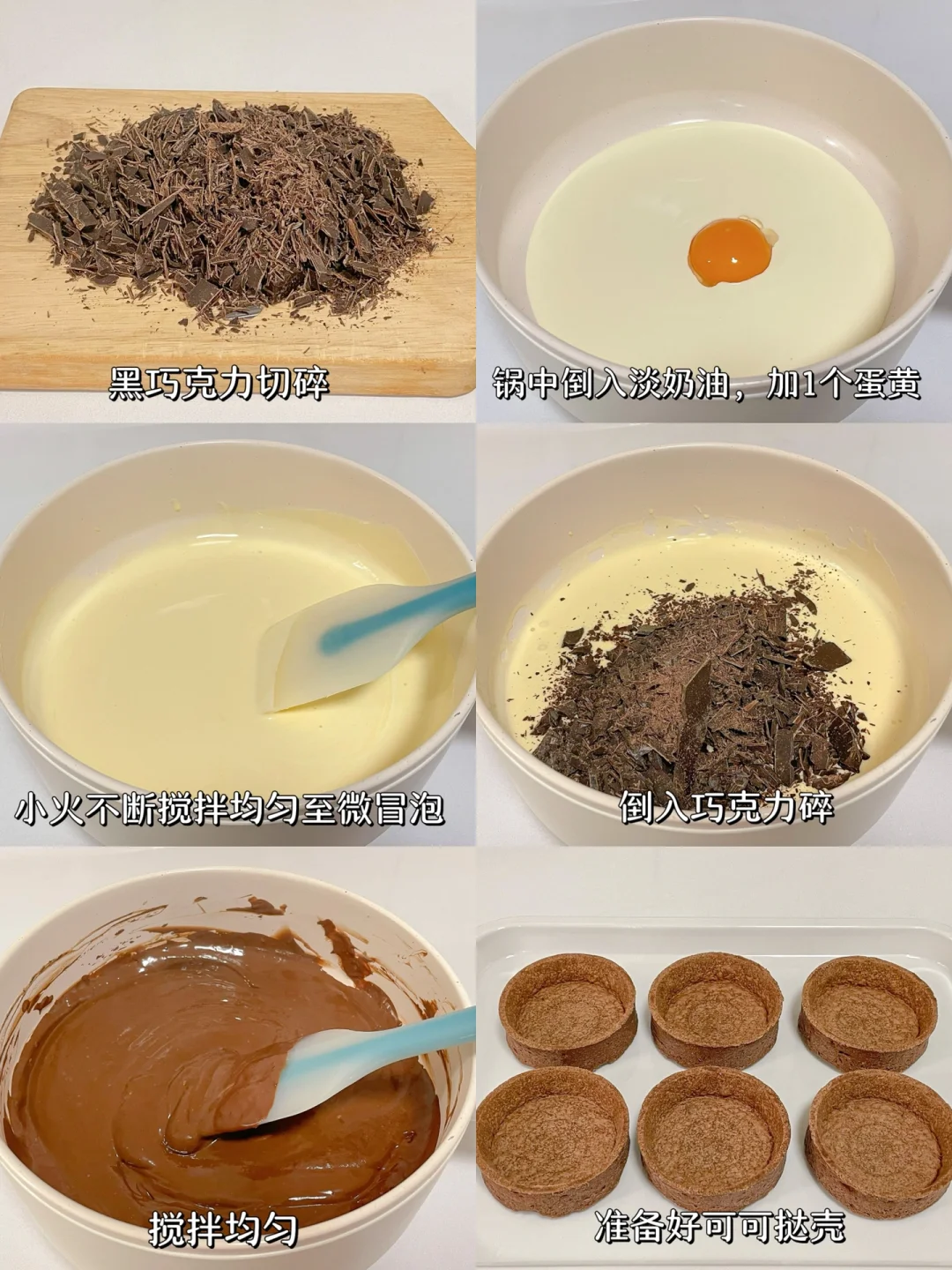 2⃣️锅中倒入淡奶油和加入蛋黄,小火不停搅拌至微微冒泡,倒入黑巧克力搅拌均匀至融化。