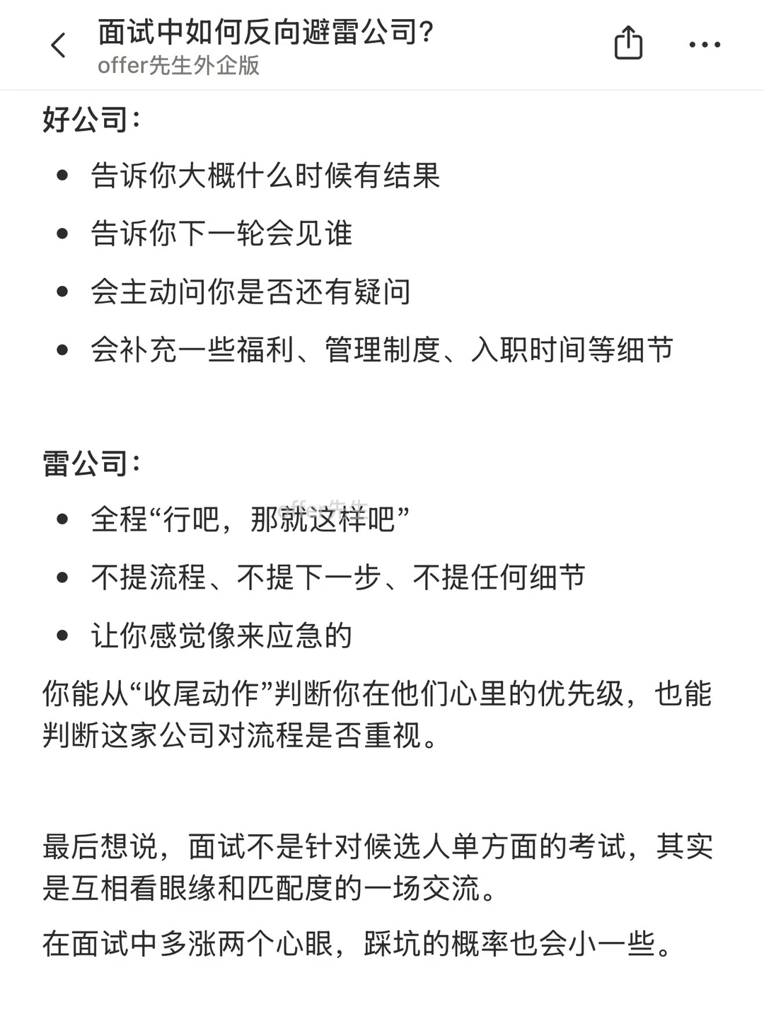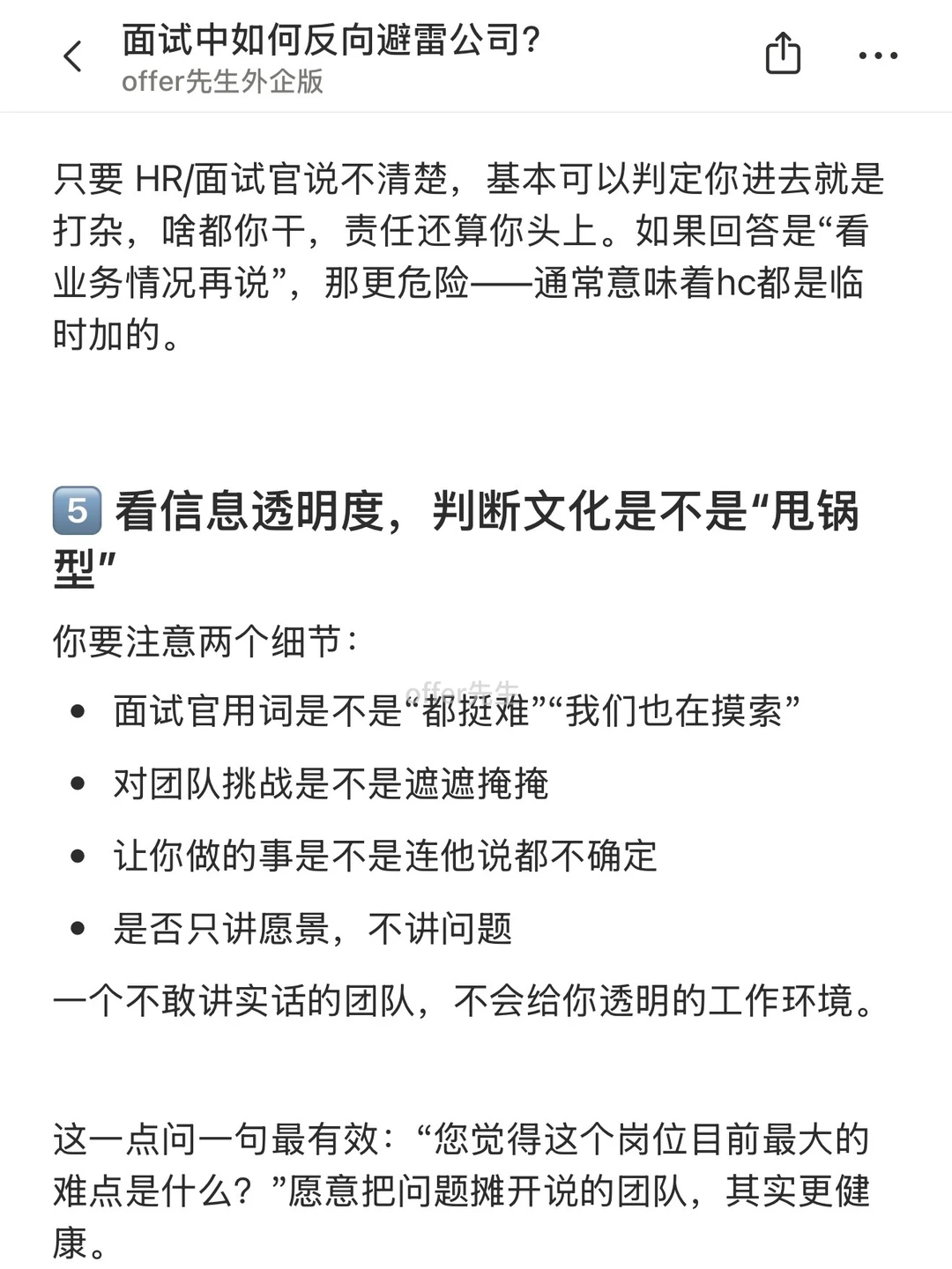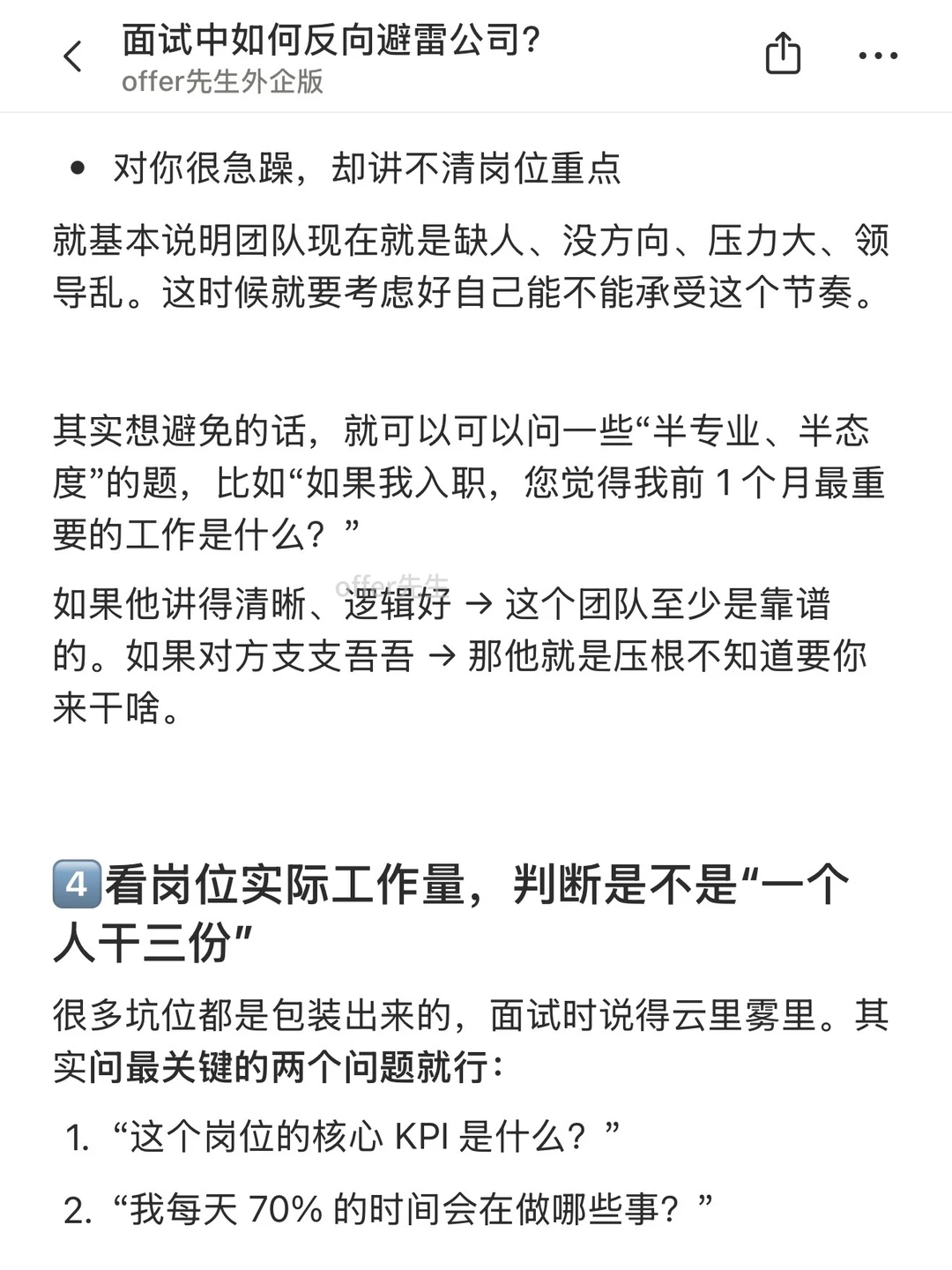 找工作的本质,不是被公司挑,而是“互相挑”。很多人找工作经常踩雷,其实就是因为只顾着好好表现,忘了自己也要观察公司。 . 面试里先避一些雷,真的能让你少走很多弯路。 . 一个认真分享“找工作”干货的账号。真诚、有料、不说空话,只想用真实经历、具体方法,帮大家少走点弯路 .