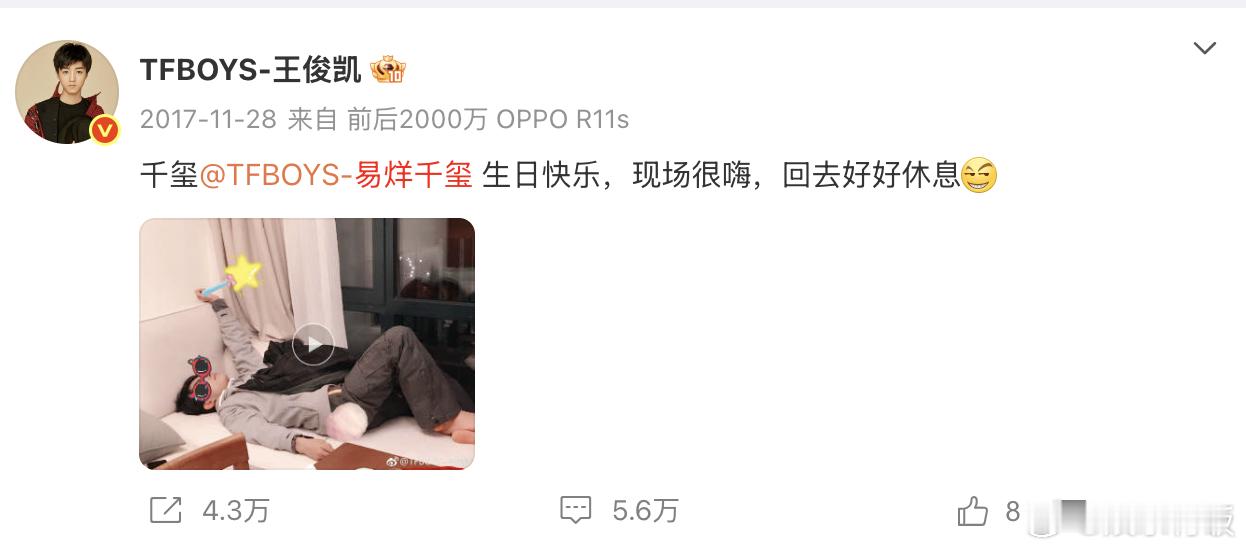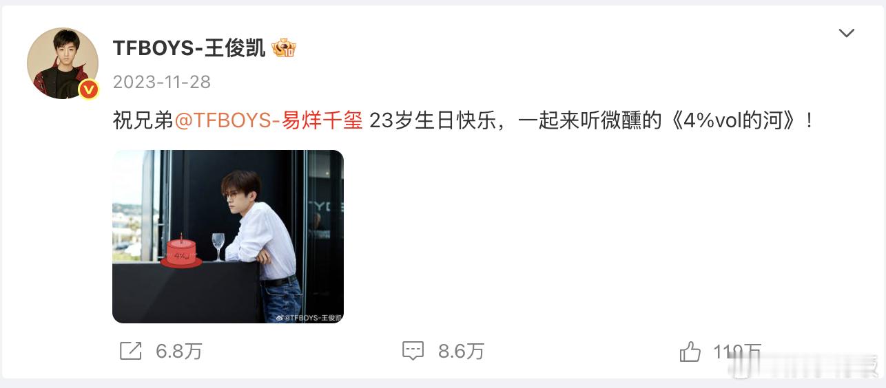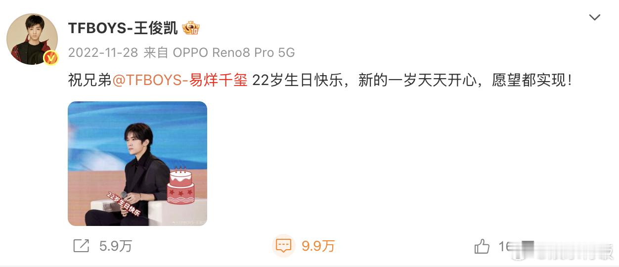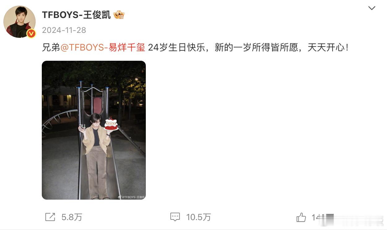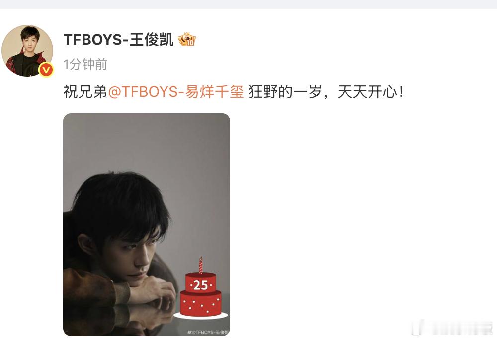 王俊凯连续13年为易烊千玺发博庆生 呜呜 又来为送生日祝福了 这是小凯为千玺庆生的第13年,千玺25年的生日里,有一半还多的时间收到了来自小凯的生日祝福 王俊凯连续13年为易烊千玺庆生
