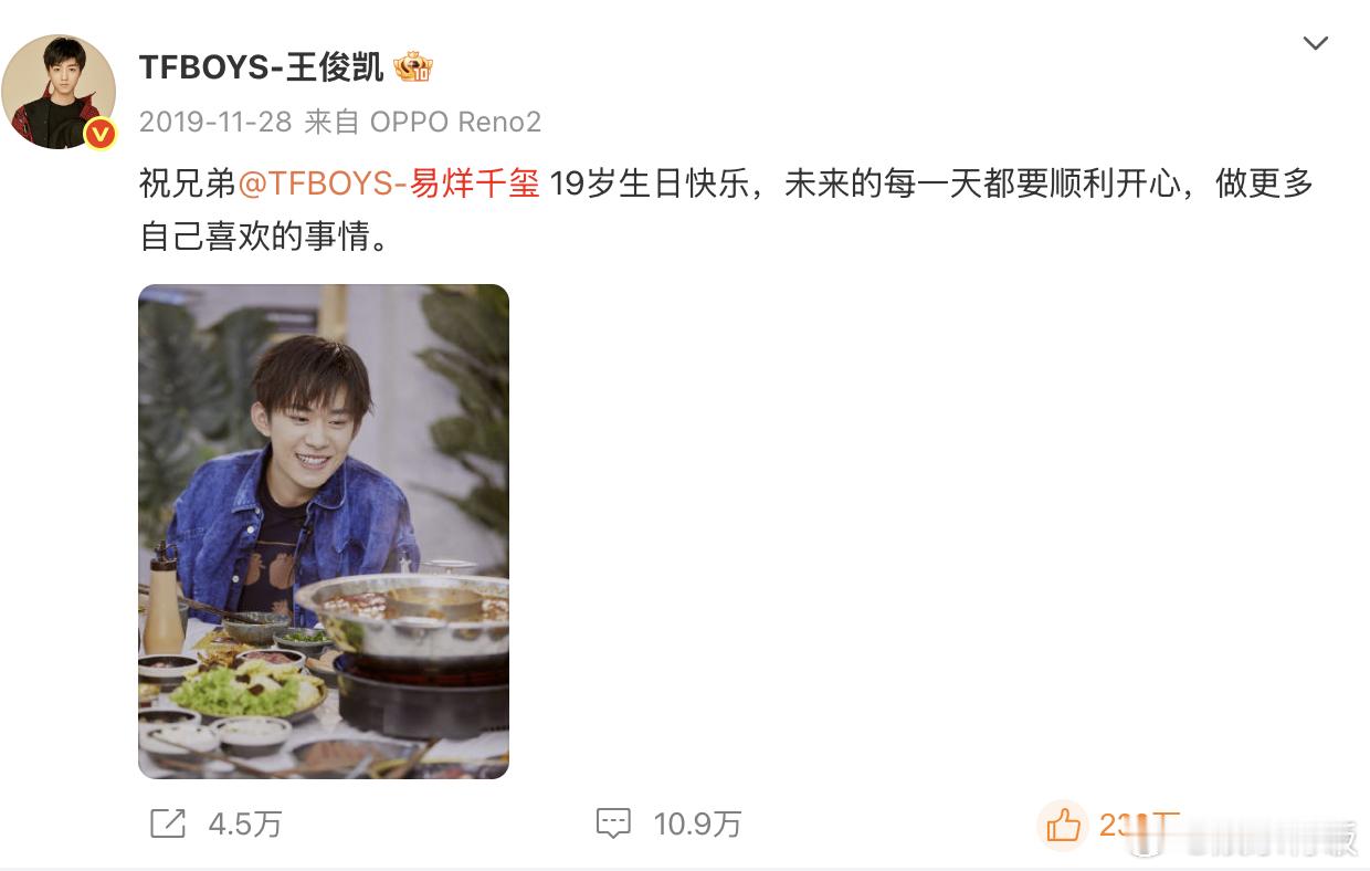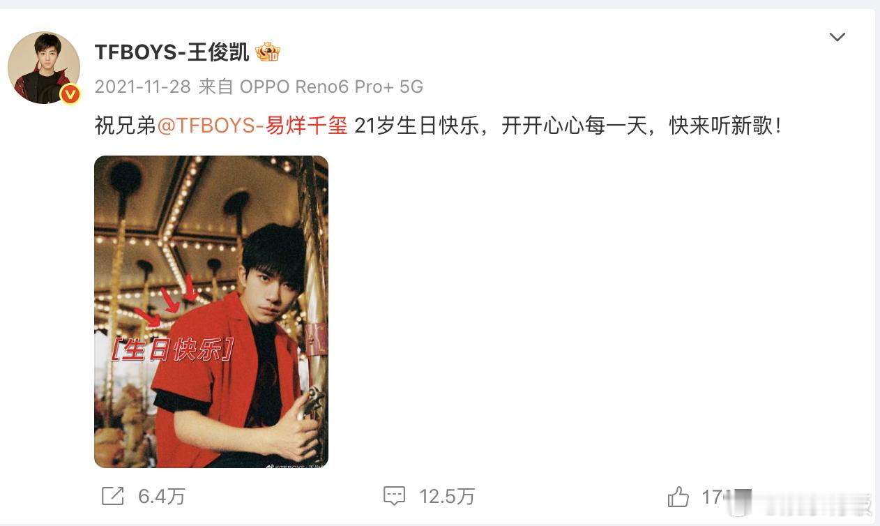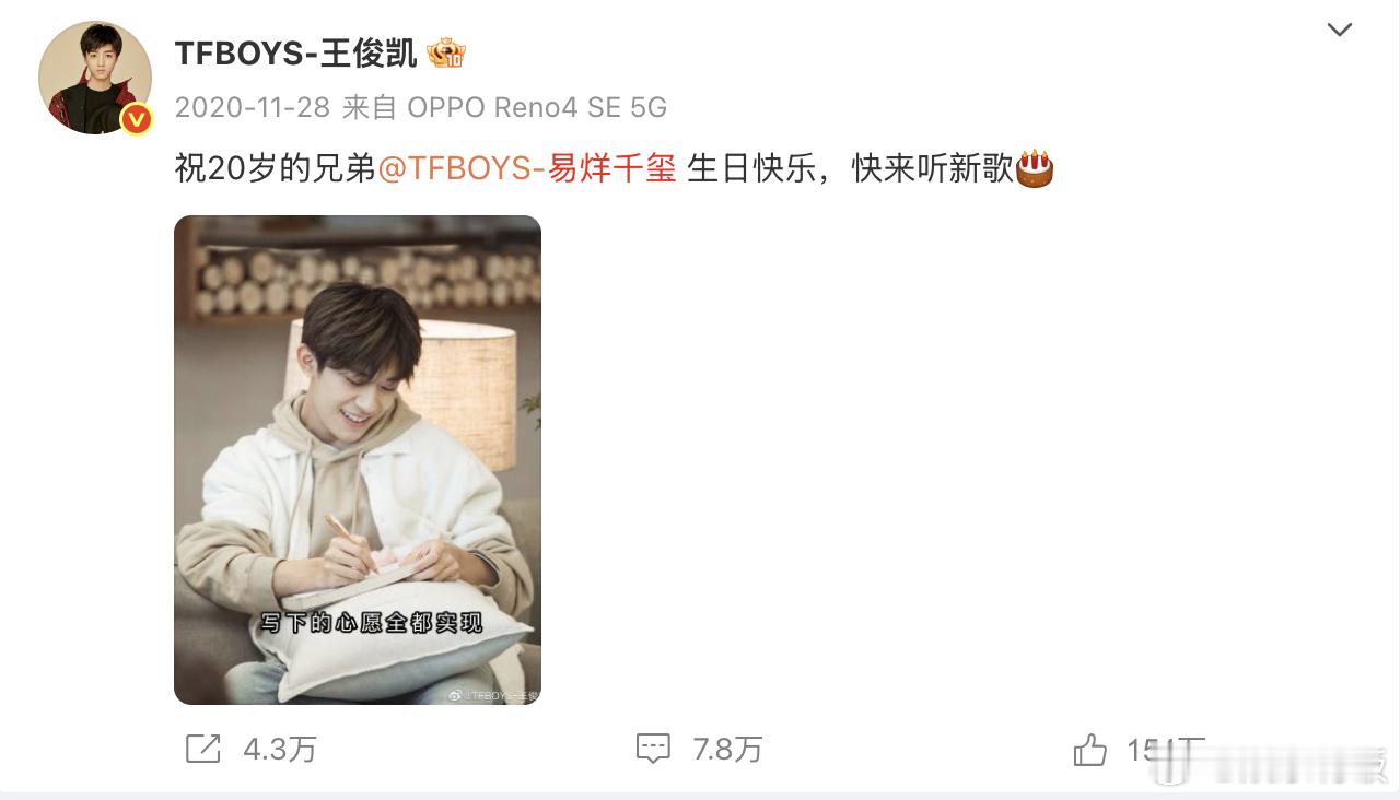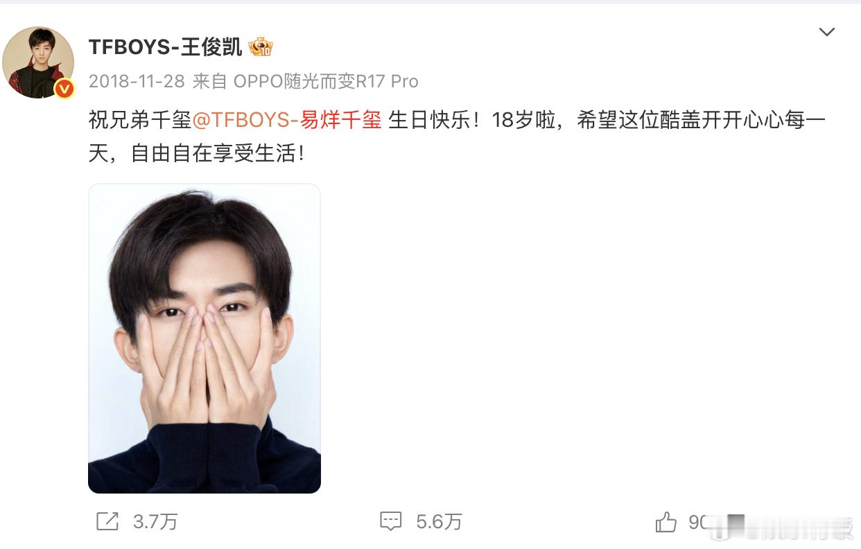 王俊凯连续13年为易烊千玺发博庆生 呜呜 又来为送生日祝福了 这是小凯为千玺庆生的第13年,千玺25年的生日里,有一半还多的时间收到了来自小凯的生日祝福 王俊凯连续13年为易烊千玺庆生