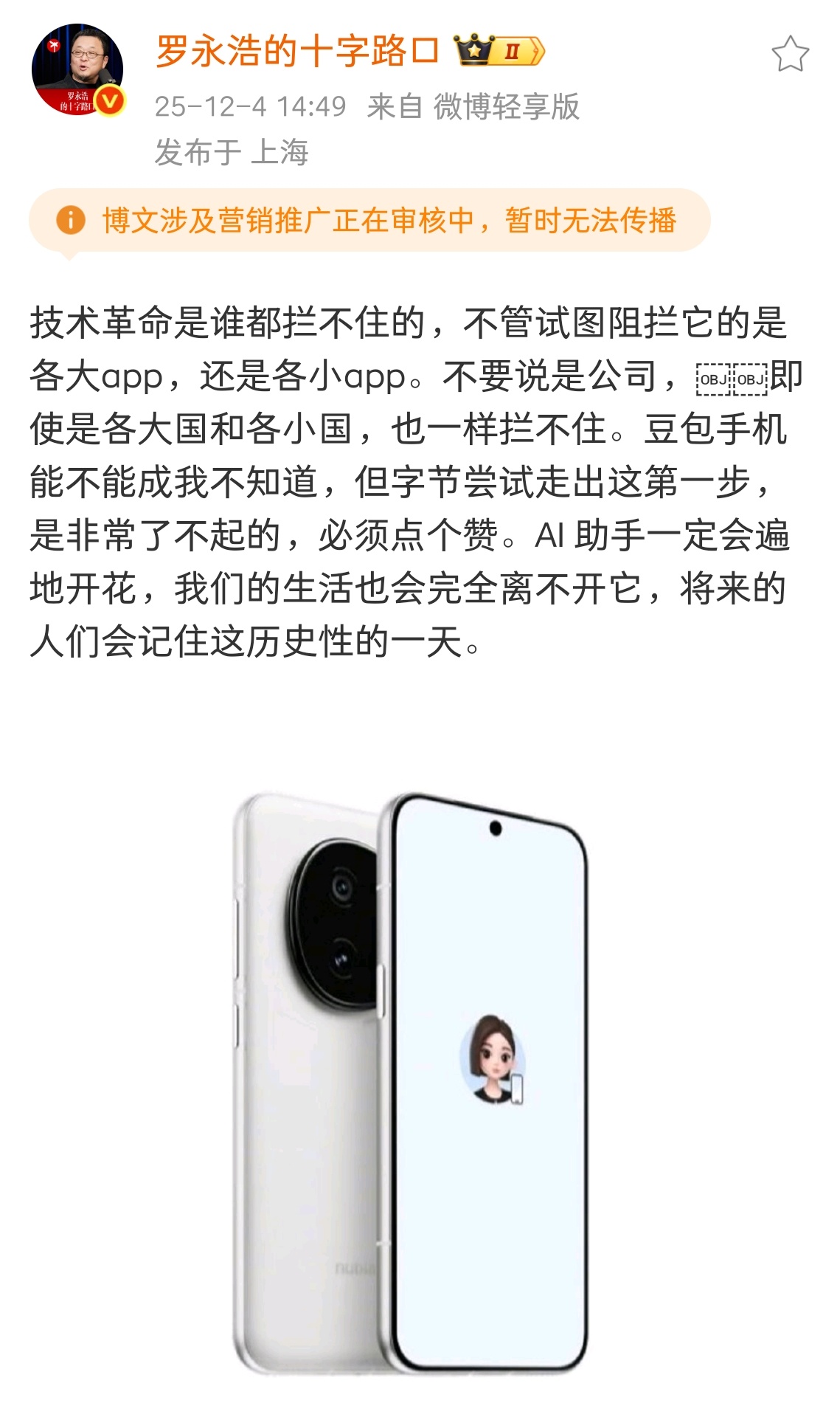 罗永浩谈豆包手机今天群里不少人都在讨论这个。微信是直接「拉黑」了豆包手机,让手机直接没法使用微信,归根结底是豆包手机好欺负,体量小,无所谓。从技术上讲,想控制微信,只要手机给了系统权限是完全没问题的,而且微信很难识别,并且有多种方案。老罗说的对,如果Ai真实带来了便利,对用户很有用,大家都去用,主机厂也开放,你微信也好、阿里也好,挡得住么?