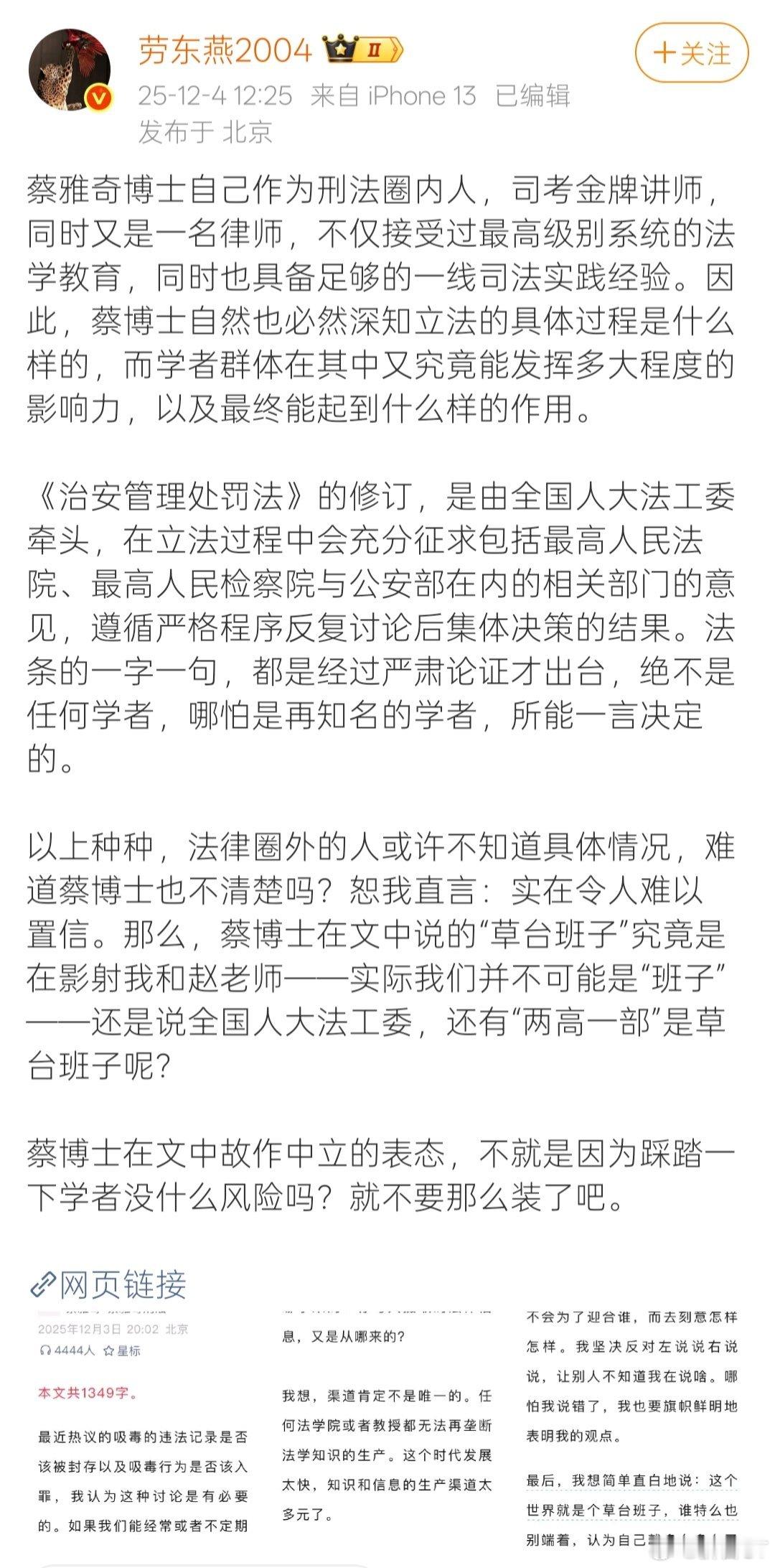 Before:“在我们这个社会,有两个特别值得玩味的现象。“一个现象是,立法机关就立法草案公开征求意见,有些人却不愿意他人就立法草案发表不同的看法。“实际上,既然是公开征求意见,说明立法机关愿意听取不同的甚至是批评性的意见。不知道为什么有些人会认为自己比立法机关更有权威,好像别人发表不同的看法,还需要进一步征得他/她的许可,而且必须与其立场一致。”After:“蔡博士在文中故作中立的表态,不就是因为踩踏一下学者没什么风险吗?就不要那么装了吧。 ”