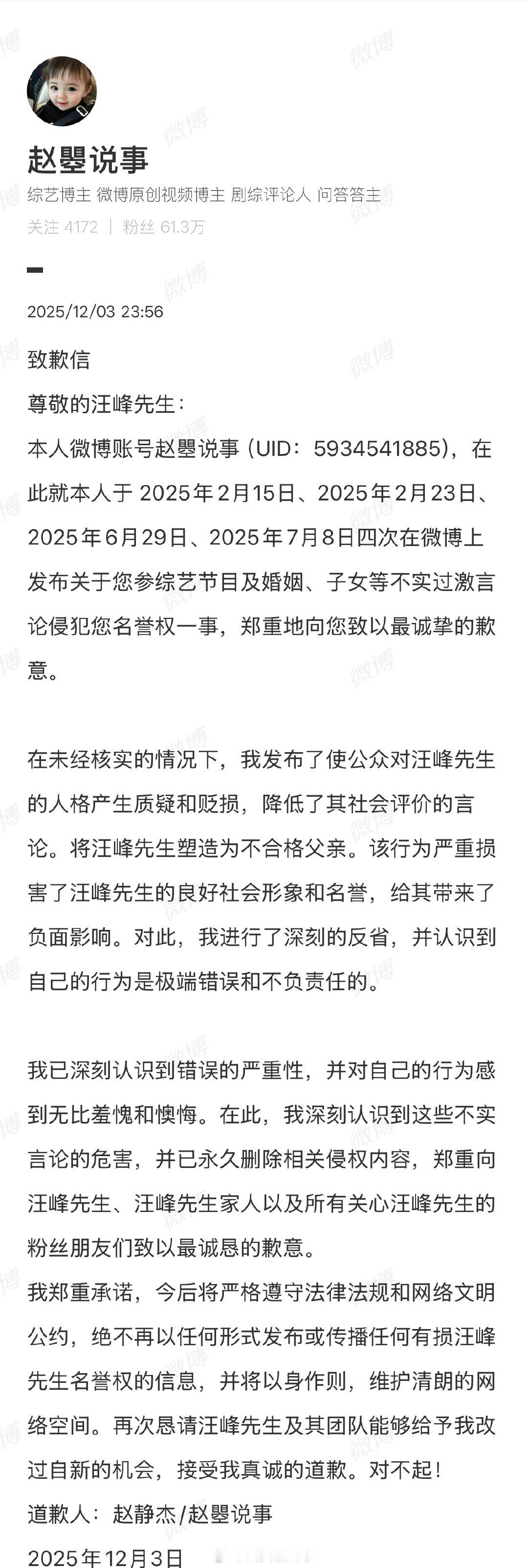 【赵曌说事向汪峰公开致歉】汪峰告赵曌说事名誉权侵权胜诉12月4日,发布声明:近日,微博用户“赵曌说事”(UID: 5934541885)在微博平台多次发布关于汪峰先生及其子女的不实信息,侵害汪峰先生的名誉权。工作室委托律师团队将该用户运营者诉至北京互联网法院,现已出胜诉判决:法院认为该用户发布不实信息的行为构成对汪峰先生名誉权的侵害、应承担相应的侵权责任,最终判令该用户向汪峰先生赔礼道歉并赔偿损失。目前该用户已公开刊登致歉信,对其发布不实信息给汪峰先生造成负面影响的行为郑重道歉,同时已删除相关侵权内容。