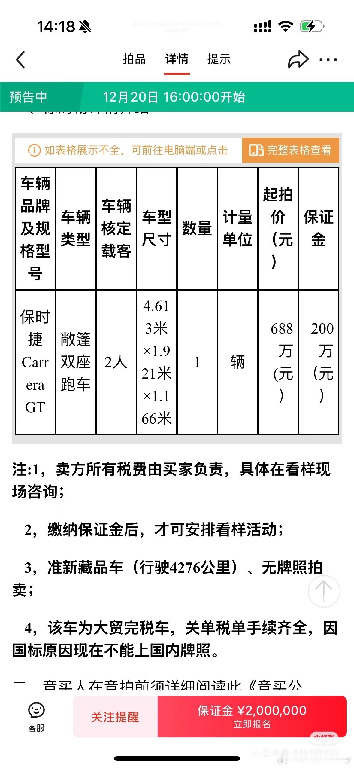 这台属于历史遗留问题的保时捷卡雷拉GT准备拍卖了起拍价6880000,价格不算贵,已经行驶4276公里应该不用缴购置税了,看看哪个大佬拍回去收藏或者转卖到国外 深圳