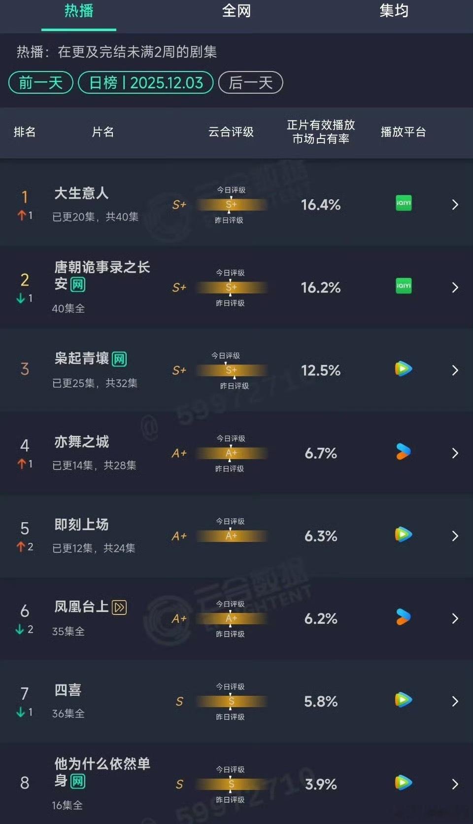 陈晓、孙千《大生意人》云合热度登顶了而迪丽热巴、陈星旭《枭起青壤》越播越低……