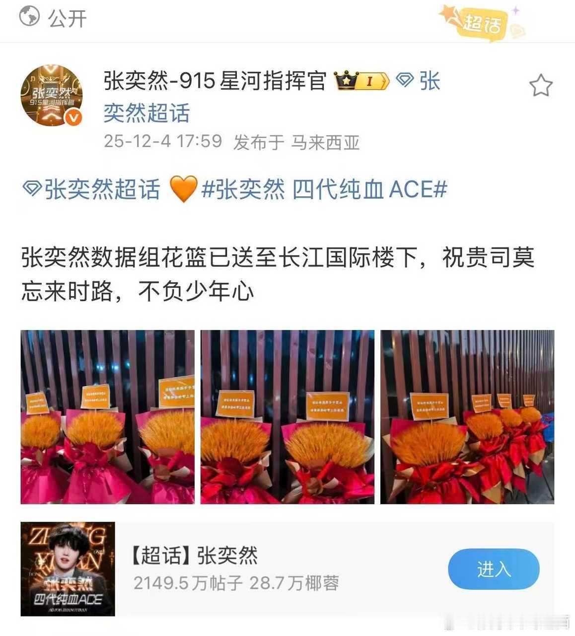 张奕然 在几乎零官方曝光的三个月里,张奕然的粉丝支持度展现了较强的韧性。其高会会员数在12月3日被提及已突破4万,相关周边也顺利售罄尽管张奕然已经回归,但粉丝们认为公司的待遇并未改善。在12月4日的一次综艺录制中,张奕然再次被排除在外,而其他数据和人气不及他的成员均获得了参与资格。这加剧了粉丝对于公司长期不公平对待张奕然的不满,并要求补偿其闭关期间缺失的曝光资源。现张奕然数据组花篮已送至长江国际楼下~