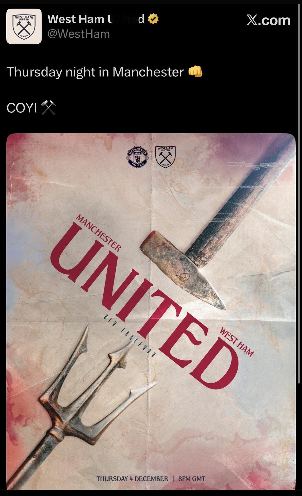 西汉姆官方的海报,做的挺好啊。虽然寓意对曼联不利,但他们愿意毒奶自己,也无所谓[憨笑][憨笑][憨笑][憨笑][憨笑]