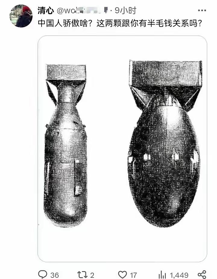 我们骄傲了吗?小胖子和小男孩虽不是我们丢在日本的,但它们让我们不再是首先使用核武器的国家。 我们承诺不首先使用核武器,但是有它们在,我们就不是了。 所以这和我们的关系很大,非常大! 我们的邱小姐比他们厉害多了,温度比6000摄氏度还高。
