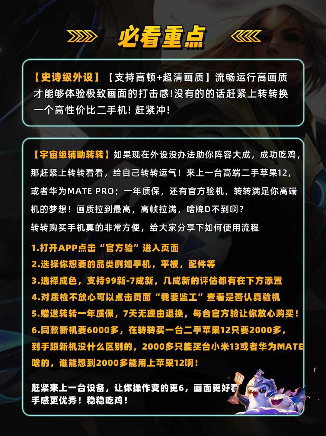 🟪宇宙级辅助(转转):如果现在外设没办法助你阵容大成,成功吃鸡,那赶紧上转转看看,给自己转转运气!来上一台高端二手机;一年质保,还有官方验机,转转满足你高端机的梦想!画质拉到最高,高帧拉满,啥牌D不到啊?
