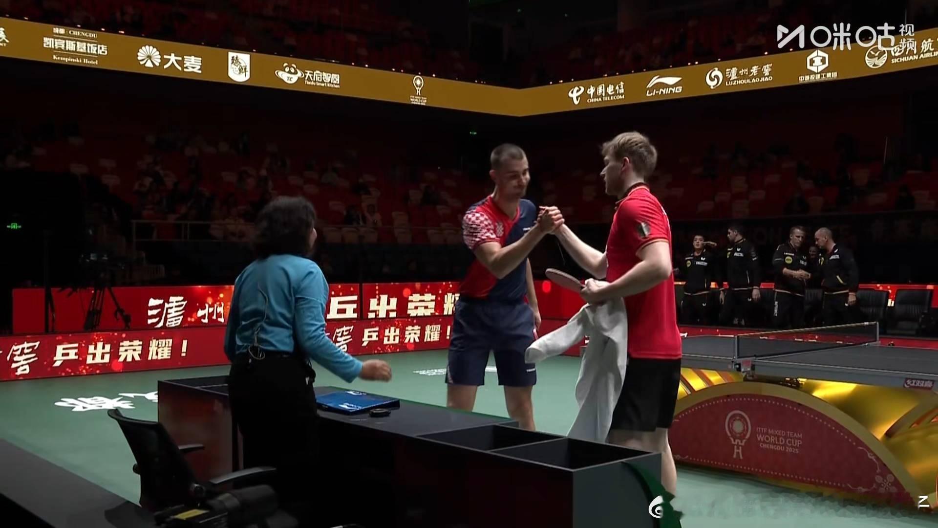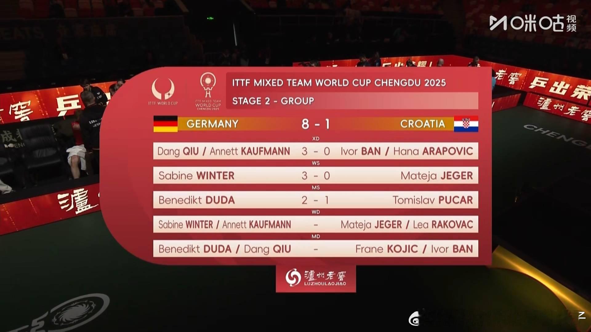 2025年国际乒联成都混合团体世界杯第二阶段:德国队🇩🇪八比一克罗地亚队🇭🇷邱党考夫蔓3比0伊沃本阿拉波维奇(8,9,6)温特3比0叶格(4,7,8)杜达2比1普卡(8,-6,10)