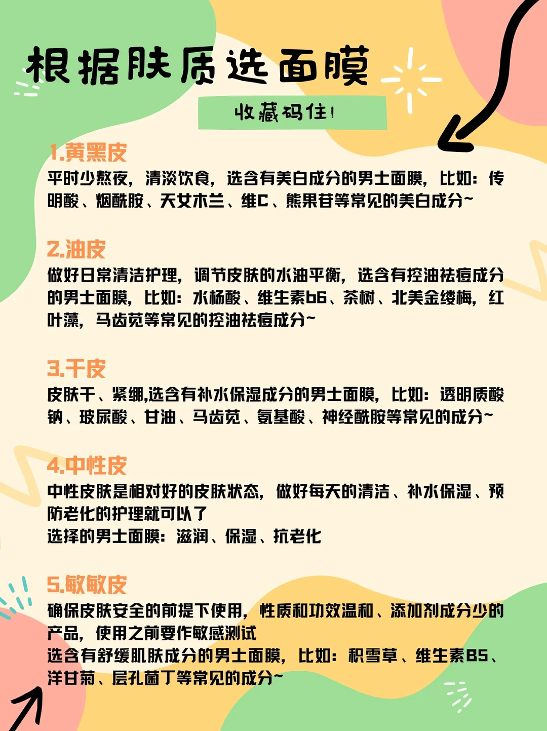 选含有舒缓肌肤成分的男士面膜,比如:积雪草、维生素B5、洋甘菊、层孔菌丁等常见的成分~