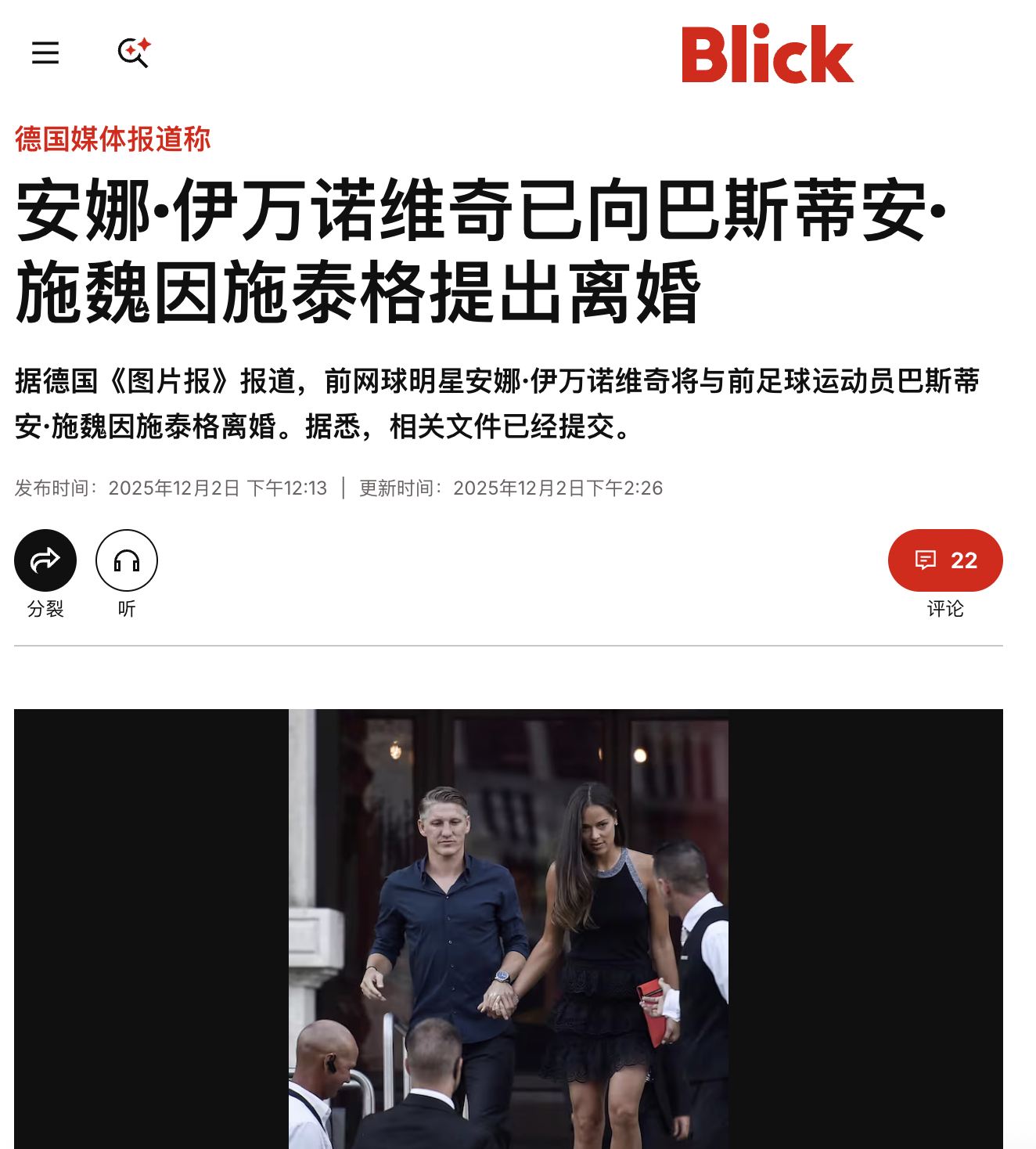 德国媒体报道,伊万诺维奇正式向慕尼黑市法院提交了离婚申请,希望与施魏因施泰格结束婚姻关系。这对前伴侣不希望在法庭上见面,他们通过律师要求尽快完成离婚程序,以便正式开始各自的生活。伊万诺维奇已提交抚养子女诉讼,希望拿到抚养权。今年7月,伊万通过她的律师解释说,在她和仍然合法的丈夫之间存在“无法逾越的分歧”,并将不忠列为分居的原因。据报道,施魏因施泰格出轨的女子来自保加利亚,并且她自己有两个儿子。她和施魏因施泰格是在伊万诺维奇儿子们就读的学校相识的,2024年夏天两人就开始来往密切。伊万诺维奇正式提出离婚