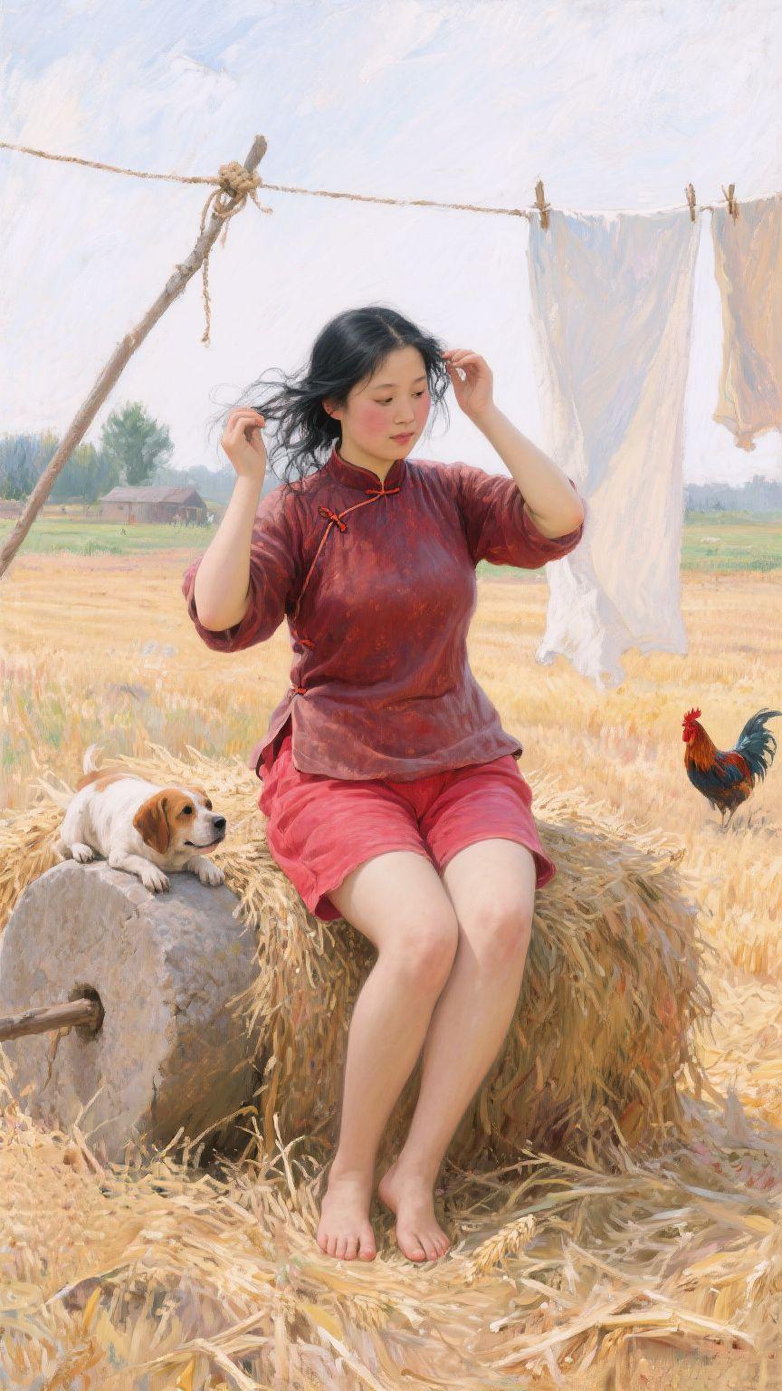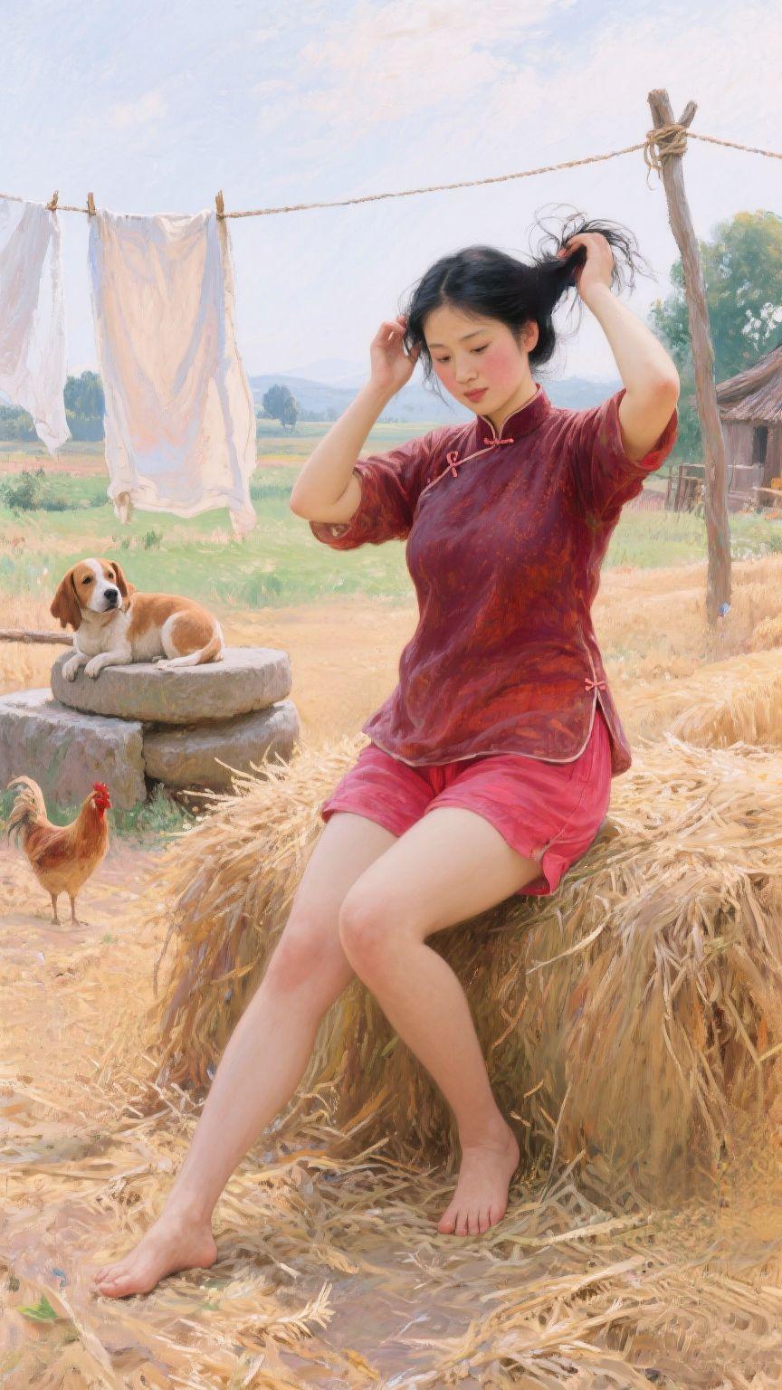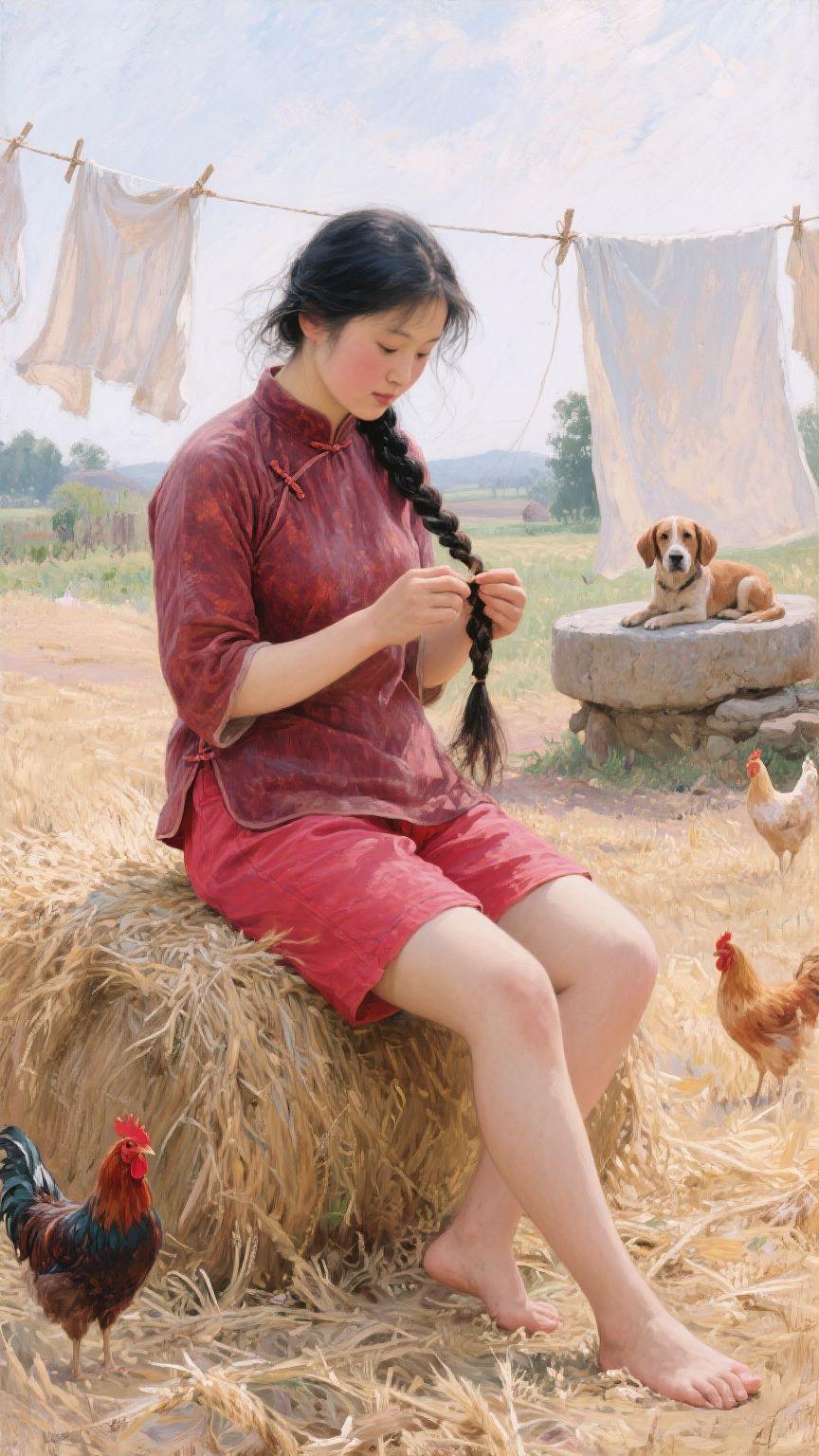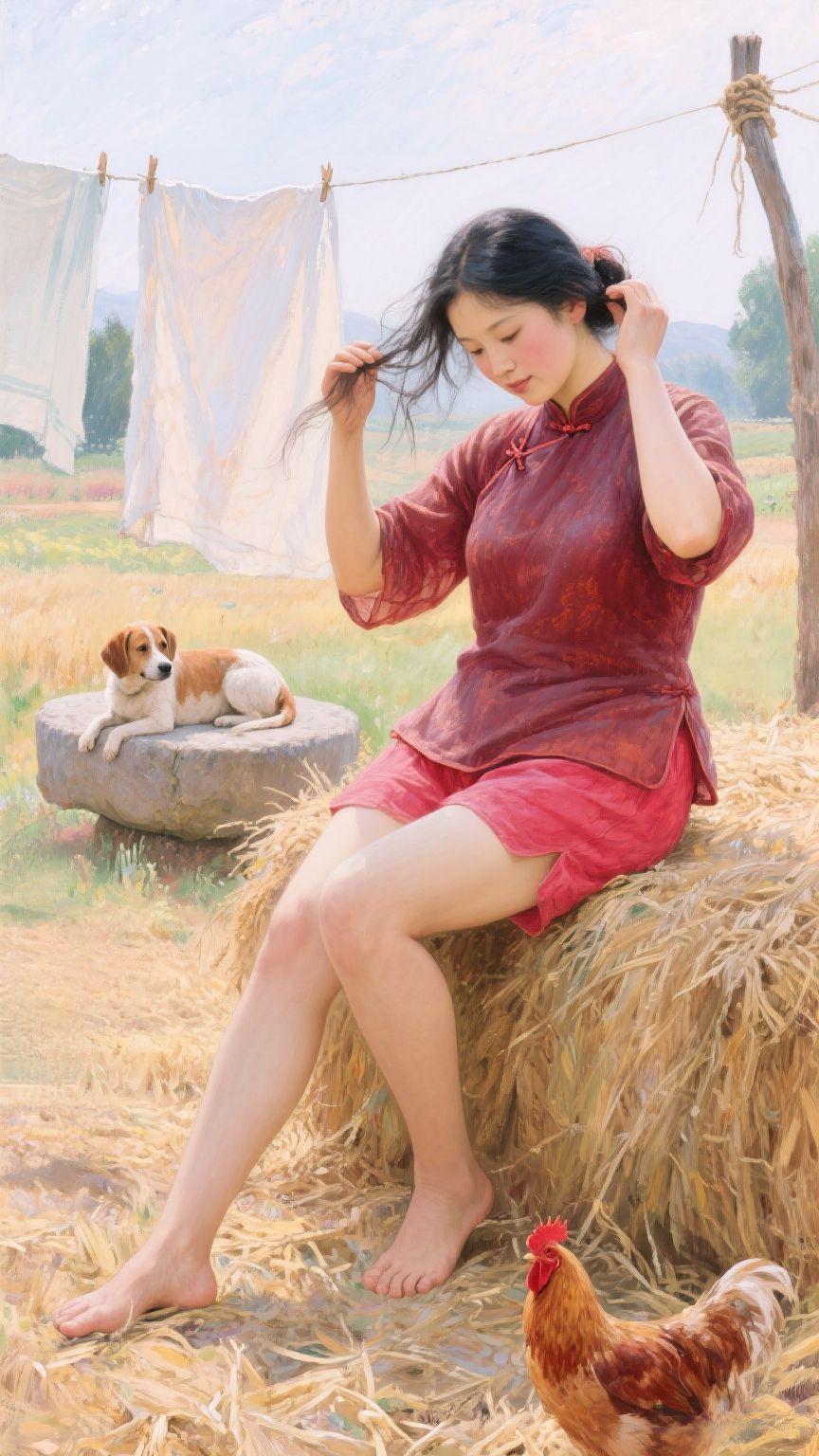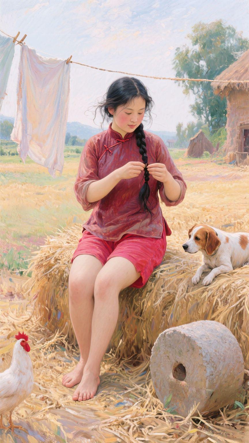 猪圈的一隅,泥土与青草的气息交织。俯身倚着水泥栏,目光落向食盆边拱食的生灵,菜叶