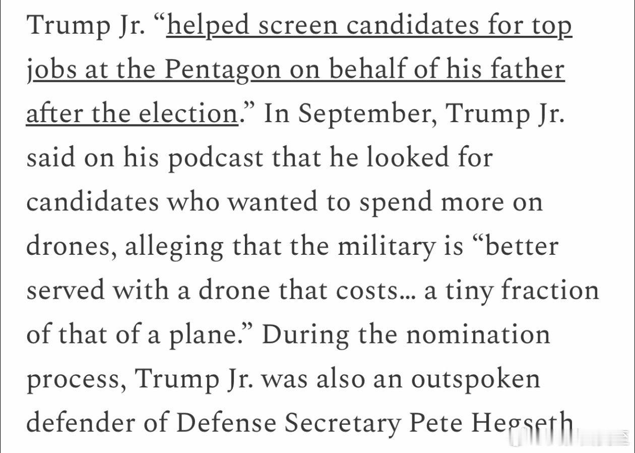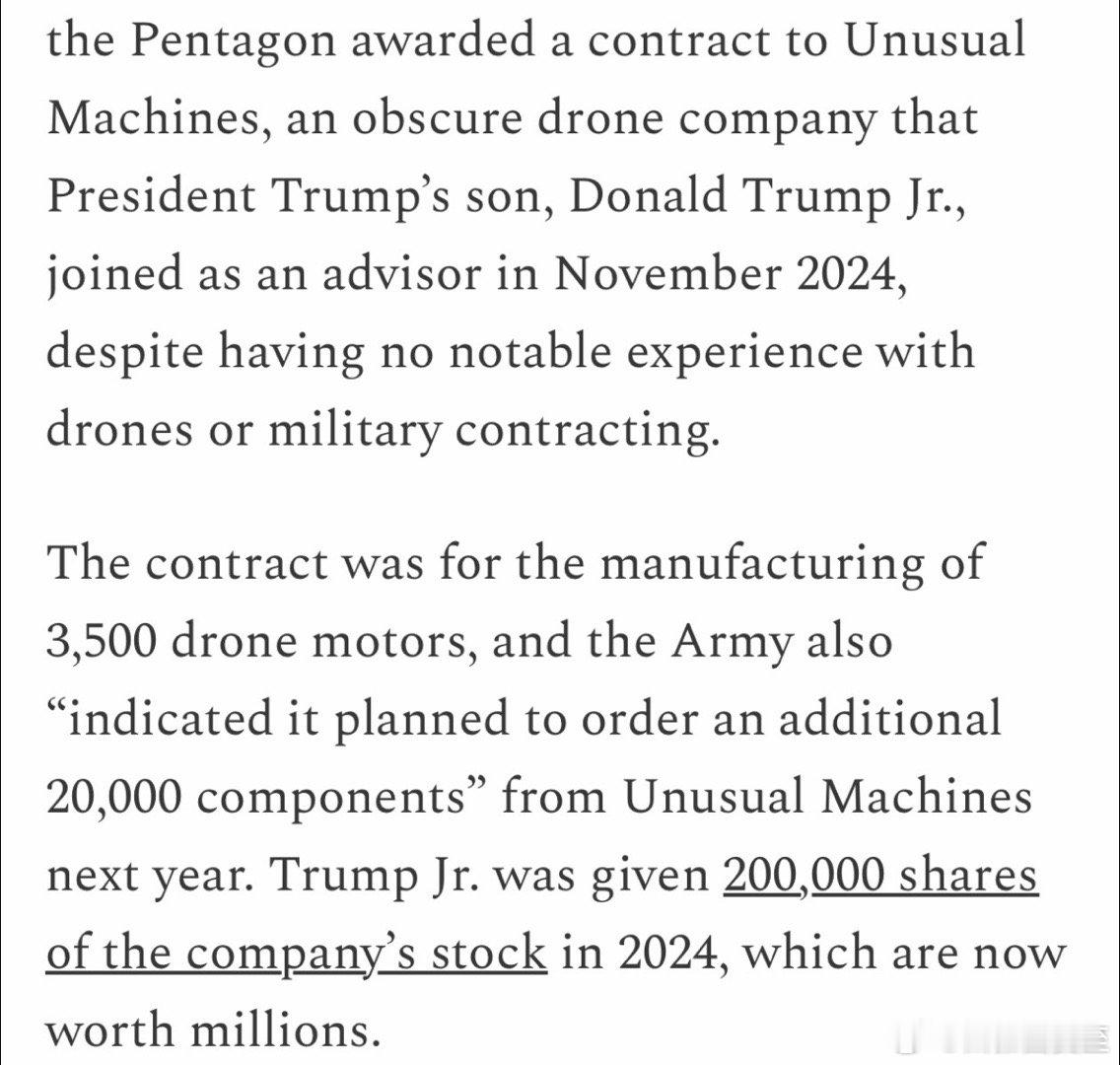 川长子当“合伙人”的“初创公司”,收到国防部$6.2亿“贷款”,用于投资“稀 tu相关业务”他当“顾问”的另一家公司,没有军用生产背景,却得到国防部无人机大单,发给他二十万股,价值数百万美元川长子在筛选国防部官员过程中发挥了重要作用,也是国防部长的坚定支持者