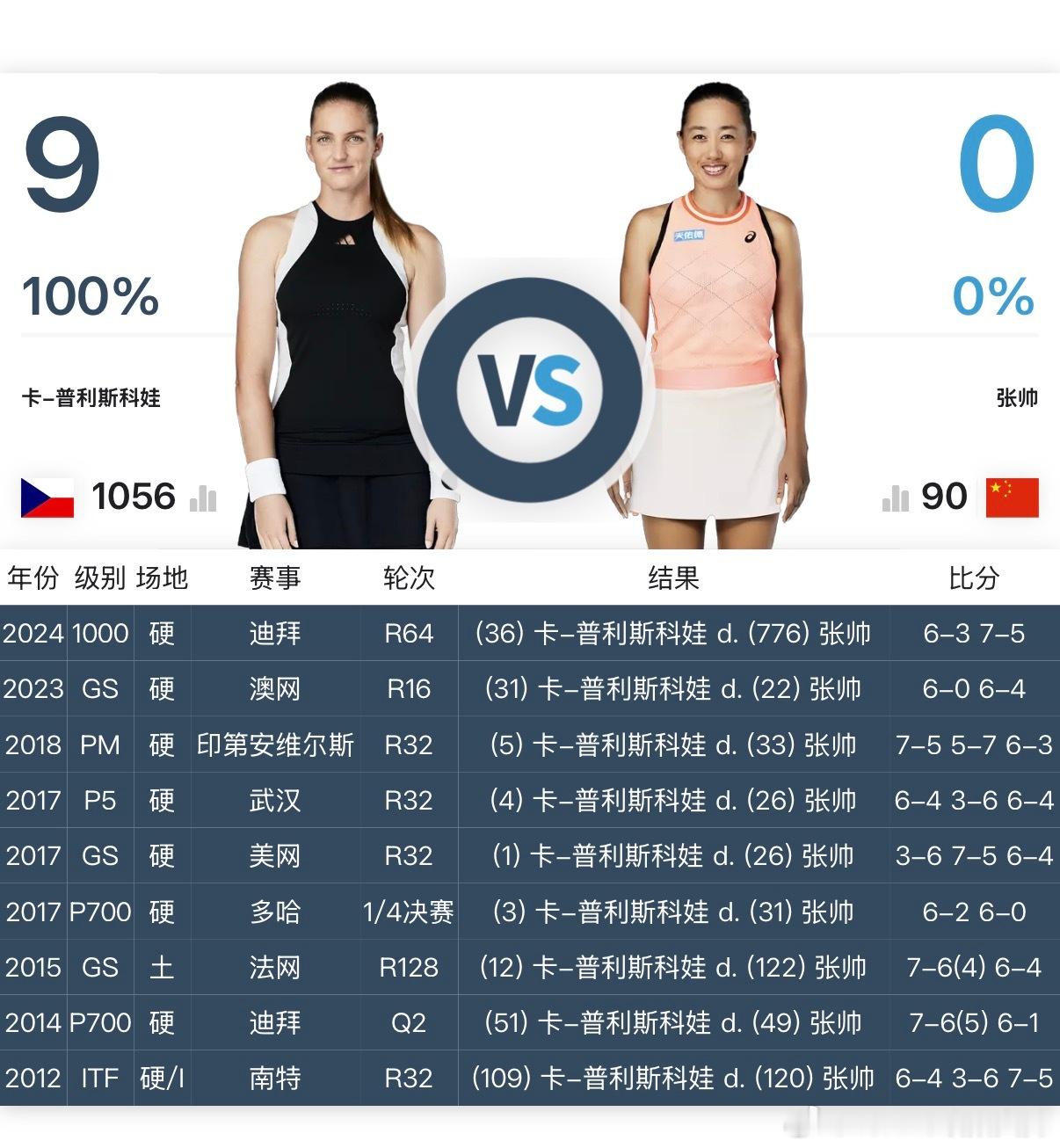 除了🇩🇪巴瑟尔和巴瑟尔同样是发球大炮+前三板进攻强势的球员——🇨🇿卡-普利斯科娃🇨🇳张帅与其交手记录0-9也是落后不过有好几场打得都很接近来着网球talking大会 丨中国网球