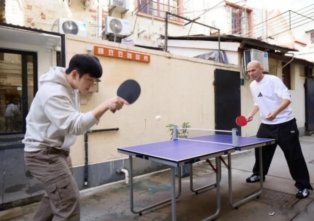 我估摸樊振东心里应该美死了吧,和偶像齐达内在上海街头打球,超梦幻的联动啊! 皇马功勋球员齐达内,在自己的社交媒体晒照,和樊振东在上海街头打乒乓球,这是早前齐达内到访上海参加活动时,拍的照片。樊振东穿着一件浅灰色T恤,挥舞着球拍,一脸的认真,侧脸超帅。另一头的齐达内面对世界冠军,严阵以待。[呲牙] 樊振东以前就点赞过齐达内的社交媒体,这次和齐达内约上了,心里肯定美美哒! 两位世界著名球星,不同领域内的优秀人物,双向奔赴,这画面幸福了啊!
