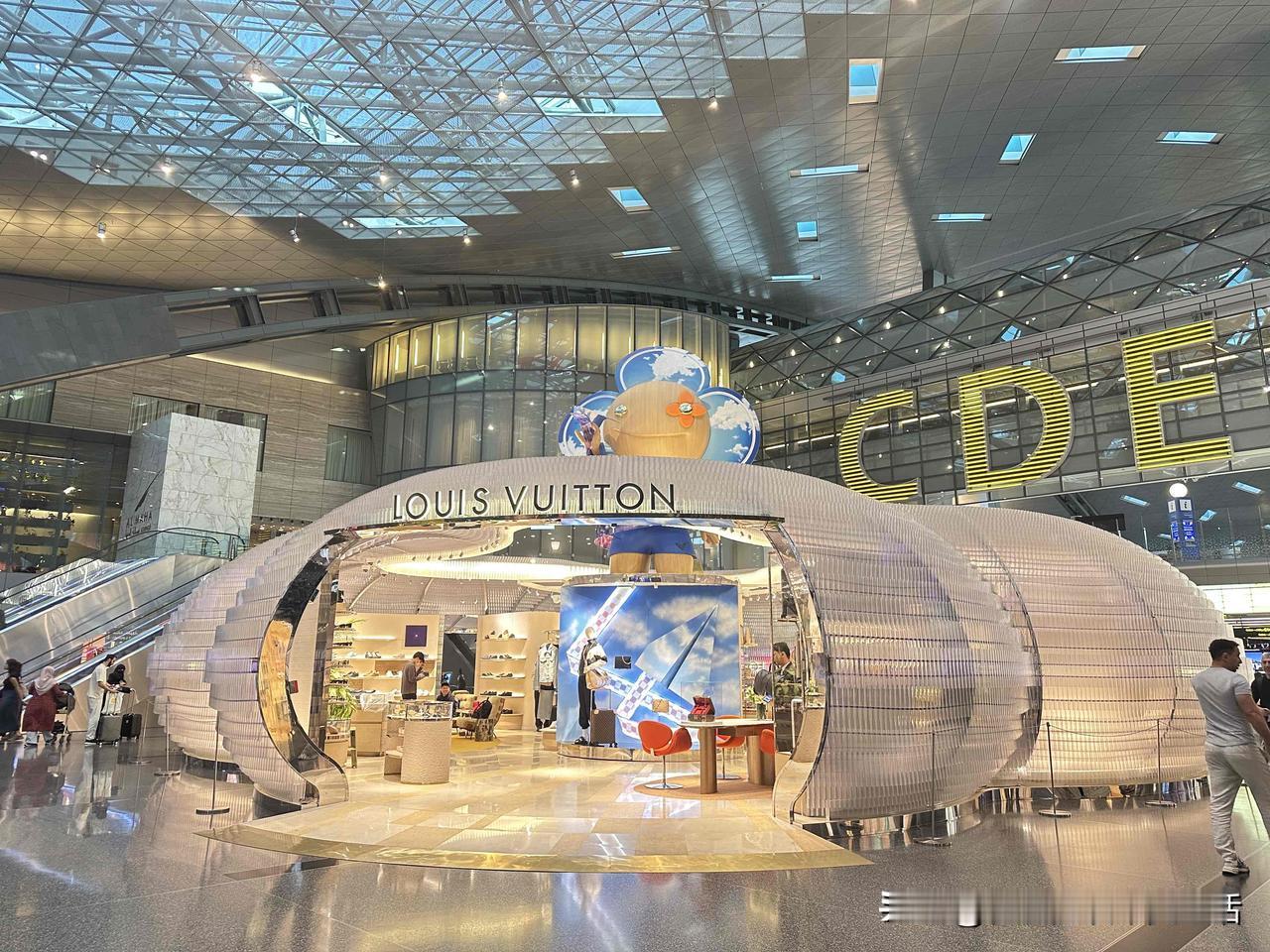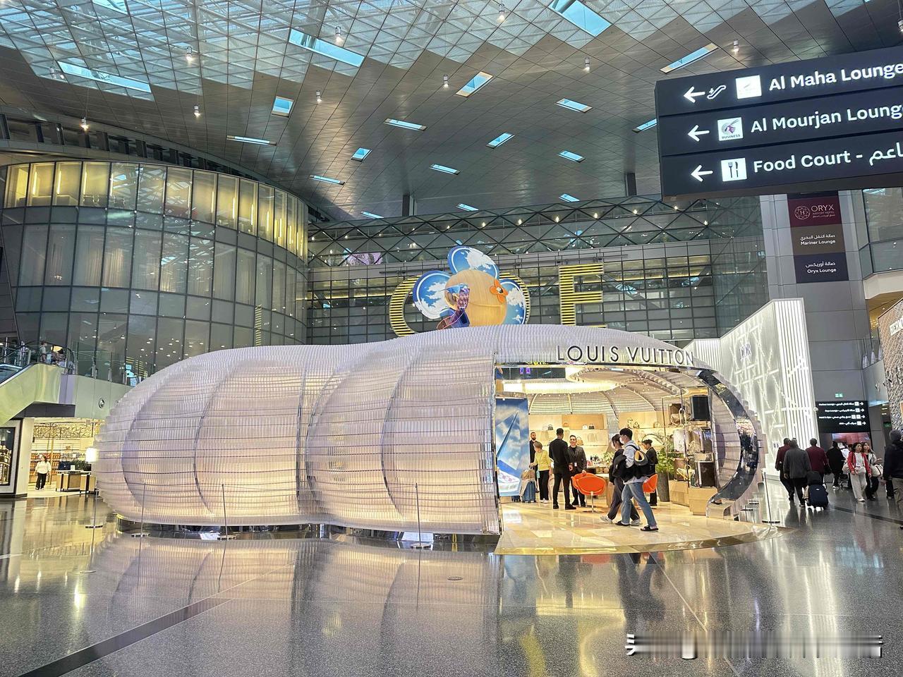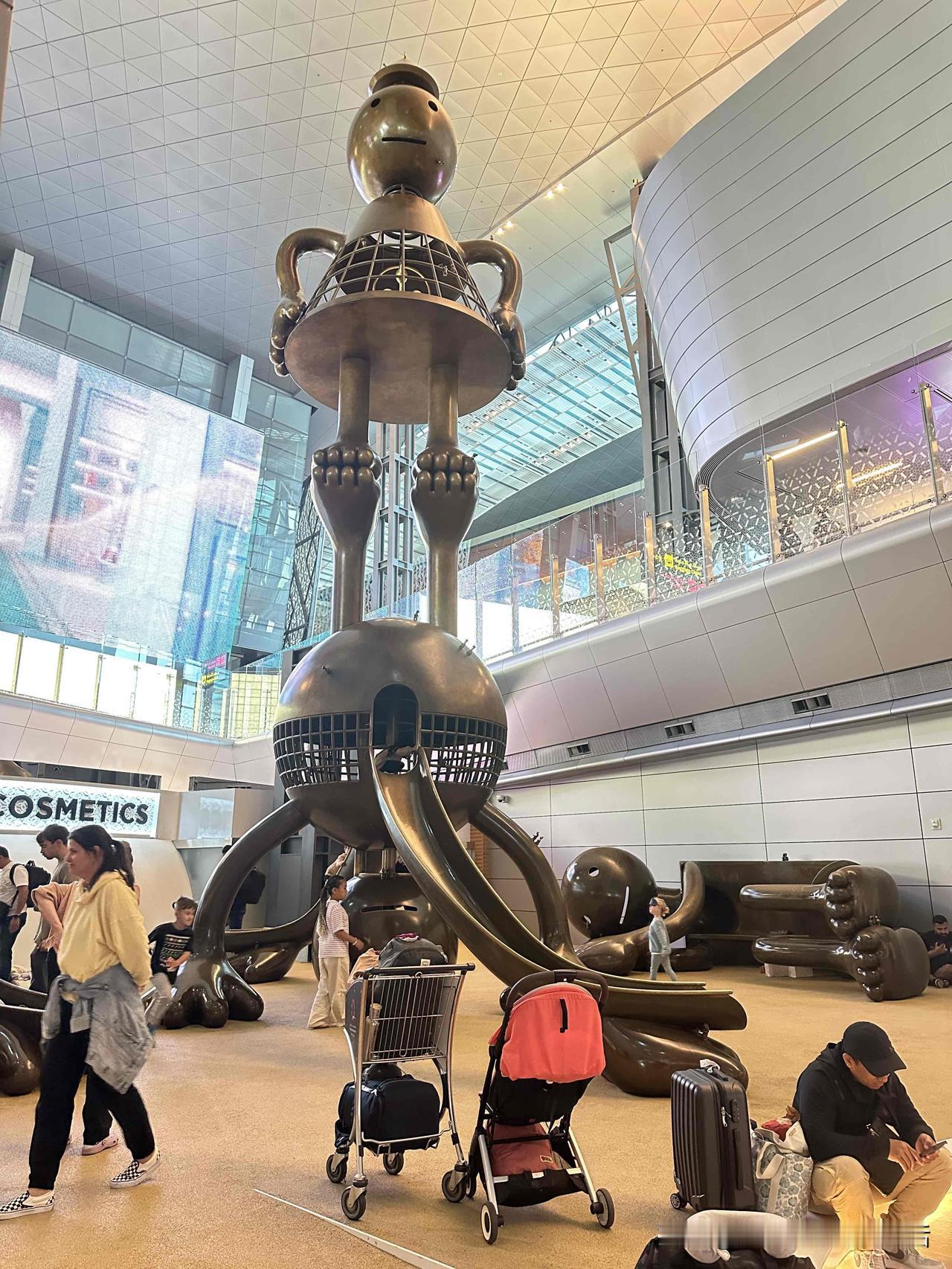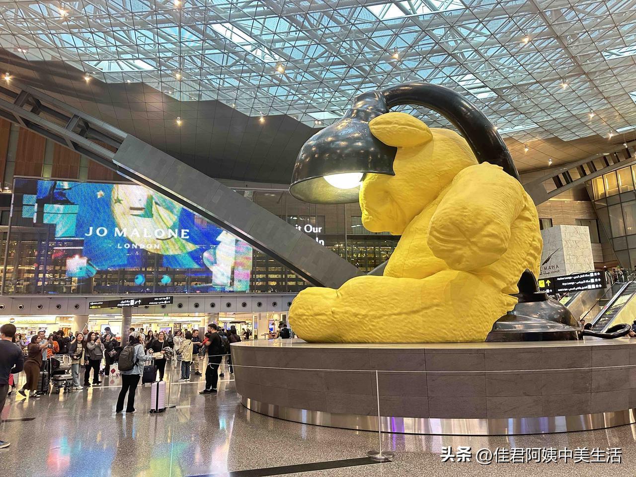 美国亚特兰大飞中国一直没直航,每次往返都得在美国境内,或者其他国家机场中转。 因此,也见识到了很多国家的大型国际机场。 今年的4月29日从中国返程,是在卡塔尔多哈国际机场,整整停留了6小时。本以为又是赶赶路、刷手机、等登机的常规操作,结果刚走出中转通道,就被大厅中央那只23英尺的发光台灯熊牢牢吸引了。 这只叫‘Lamp Bear’的巨型雕塑也太讨喜了!看着像软乎乎的毛绒玩具,实则是青铜材质,头顶一盏暖黄的灯,在明亮的机场大厅里透着可爱的样子。我绕着它转了两圈,顺手合拍了几张纪念照。 我茫然地在机场里闲逛,走到一片片绿植环绕的休息区,想着喝杯咖啡打发时间。 中东人民真的很爱甜,几乎人人都要加一堆糖料。点单小胡子帅哥,得知我只要一杯纯素拿铁,不加糖浆不要雪顶也不淋巧克力酱,一脸震惊。 这杯咖啡8美元,有点小贵。海外生活