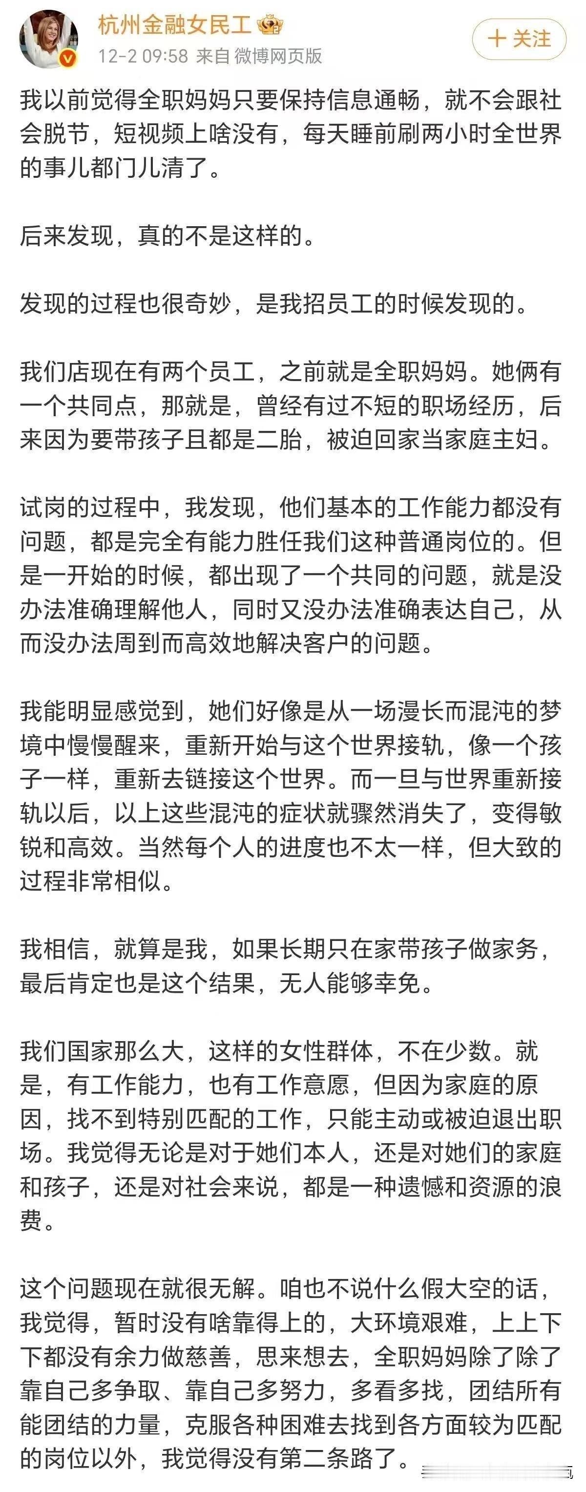 职场女性—家庭妇女—职场女性。 这三个转变的背后,就是一个人与世界的连接。 家庭妇女失去了与世界的连接,或者与世界连接变的不完整,然后就进入职业生涯的真空地带,重新出来进入职场也会很难适应。 离群但不索居,然而要再合群已然很难。 这是真的。对很多人来说,的确如此。 那怎么办?家庭妇女从此与世界隔绝,进入真空混沌状态吗? 非也非也。 保持阅读、学习、有效社交,与家人构建和谐美好的共进关系,可以让你从孤岛的深处走出来。 最不济的,就是开个股票帐户,加个群也不错,不是听所谓专家的,而是当一个窗口,交流检验自己,如此你也可以进入一个不但刺激你大脑还刺激你思想和情绪的世界。 你与世界的连接绝对变的越来越清晰。