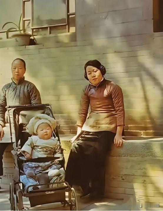 照片中的这三个人,一个是年轻的母亲,一个是坐在婴儿童车里的女儿,另一个应该是仆人。这个年轻的母亲,可不是一般人,她就是大名鼎鼎宋氏三姐妹中的大姐宋霭龄,拍摄这种照片的时候是1915年,当时她27 岁,坐在婴儿车里的孩子,就是她的大女儿孔令仪,在1915年就能够坐这么高级的婴儿车,一般的孩子是不敢想象的!