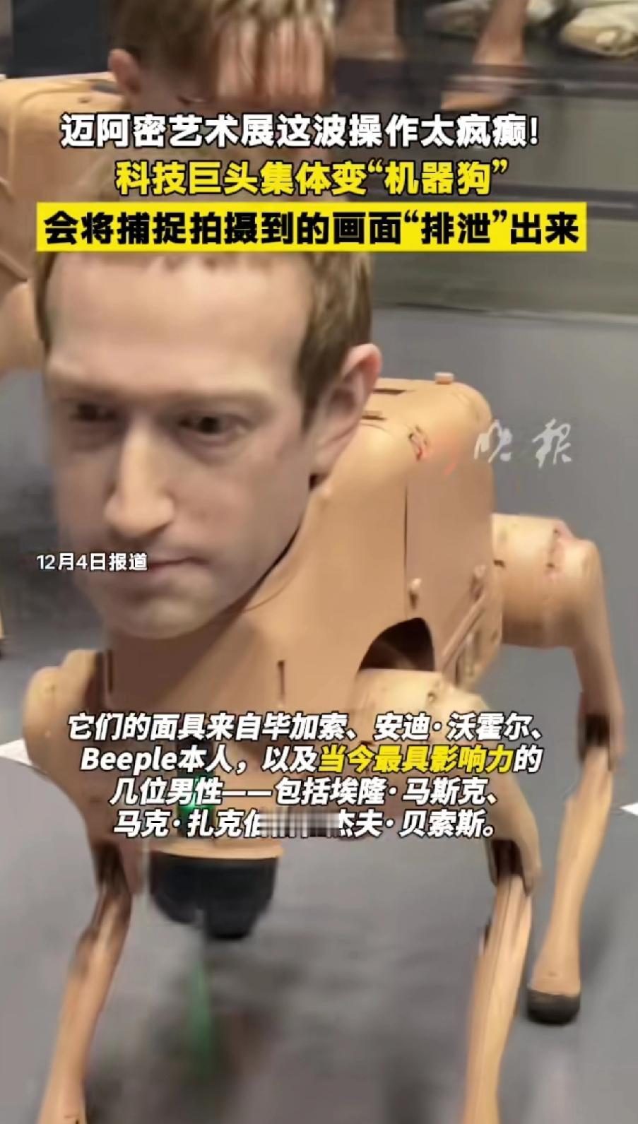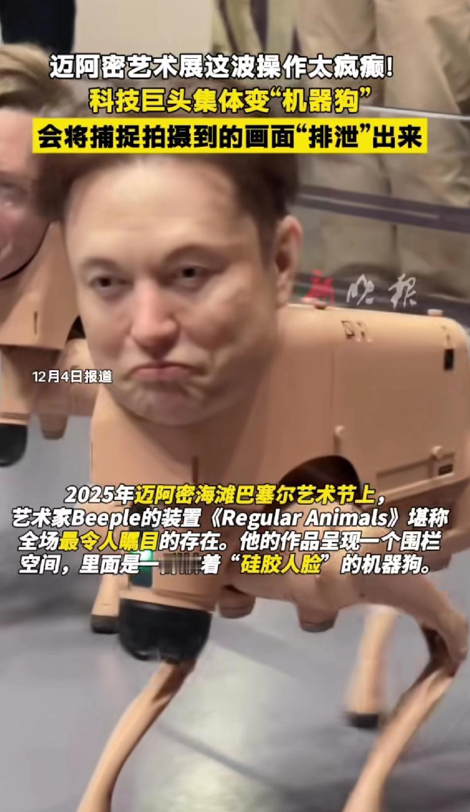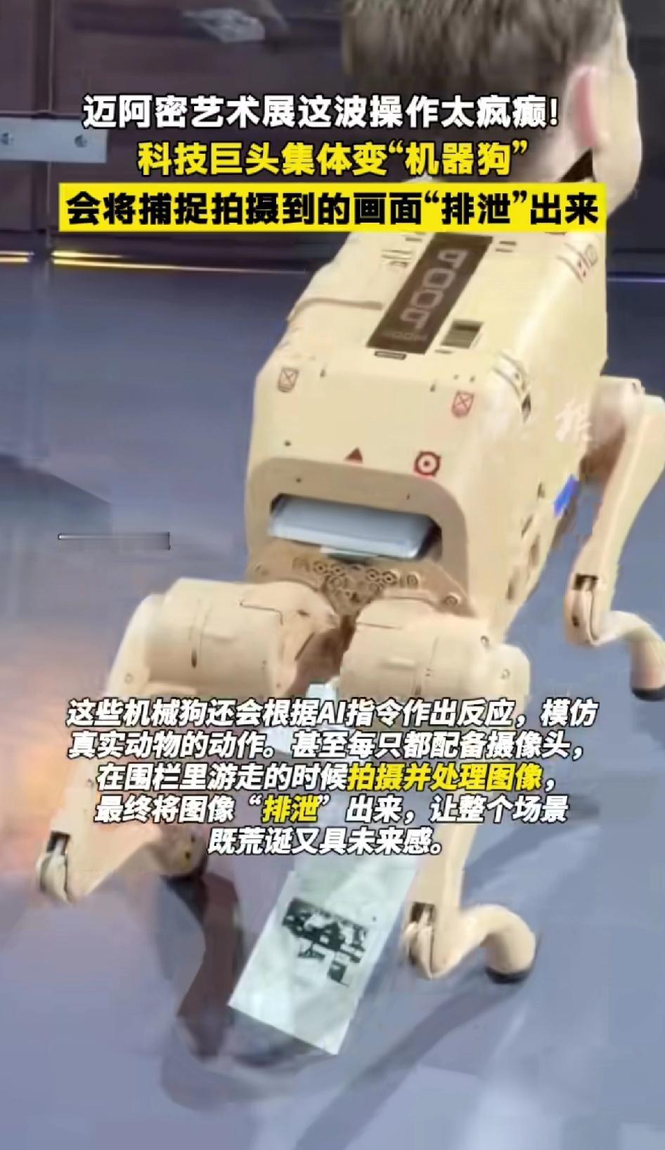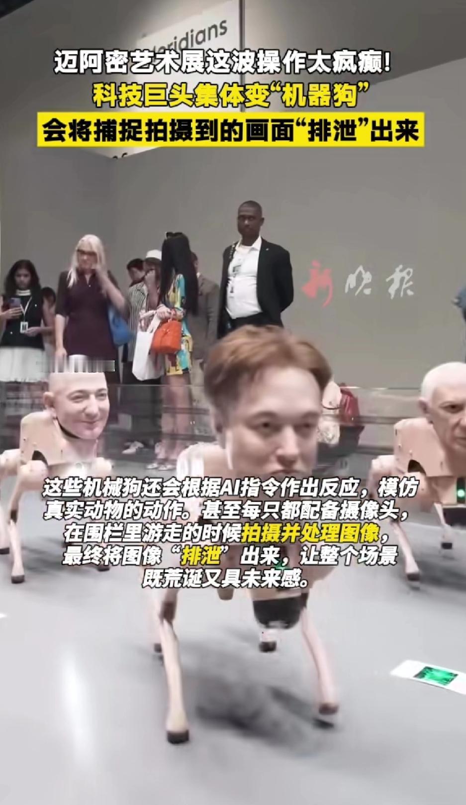 迈阿密艺术展这波操作太疯癫了,科技大佬集体变“机器狗” 靠着捕捉到的画面再“排泄”出来。 这波所谓的艺术展,将众科技巨头的“硅胶脸”安装在机器狗脖子上,画面逼真,连头发丝和面部表情都如“真人”一般。 这些科技大佬被人用硅胶脸安装在机器狗身上,又被围在围栏里,依靠身上装的摄像头拍摄画面后“排泄”出来,让整个场景“荒诞”又颇具未来感。 只是不知道这波艺术展结束后,会不会因打官司而破产。 更好奇那些科技大佬,看到自己的硅胶头像被安装在机器狗身上又“排泄”资料,会是什么反应?