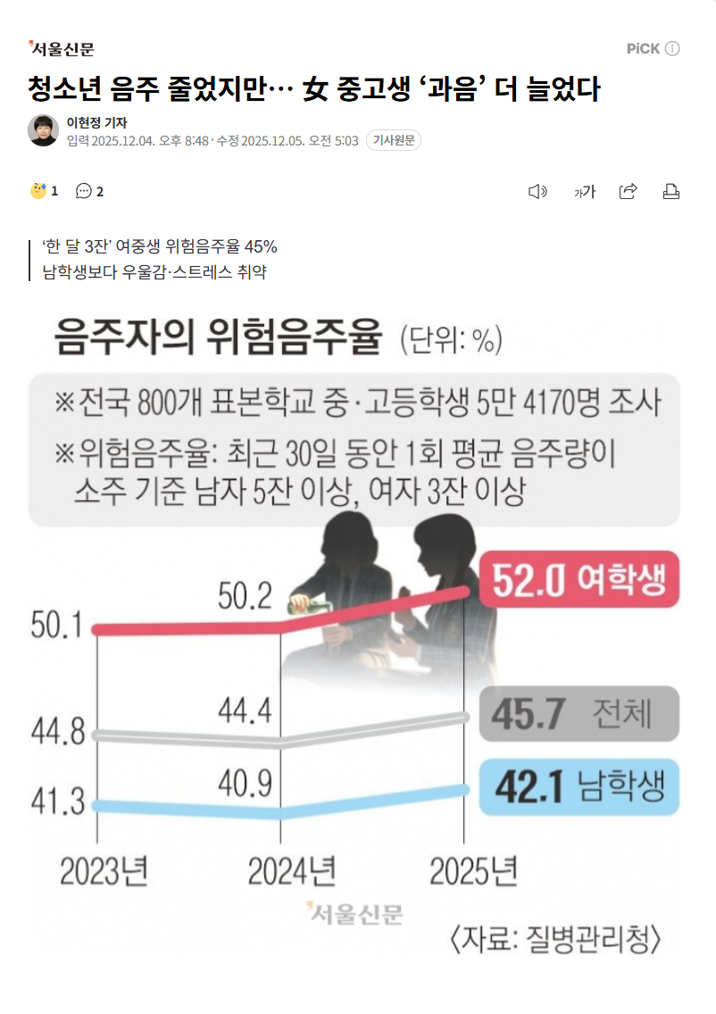 【韩国青少年饮酒有所减少,但初高中女生“酗酒”更多】海外新鲜事热点现场 韩国初高中女生的饮酒情况不容乐观。虽然全体青少年的饮酒率有所下降,但一次性大量饮酒的“危险饮酒率”反而上升了,而女生是其中的主体。专家们指出:“越是抑郁情绪、学业竞争、外貌压力、同辈关系等情绪负担大的群体,越有可能导致危险饮酒”,并强调应更加关注青少年的“心理健康”。根据韩国疾病管理厅4日发布的《2025年青少年健康行为调查》,近一个月内有过饮酒行为的女生中,有52.0%属于“危险饮酒”,这一比例高于男生(42.1%)。危险饮酒是指最近30天内,平均每次饮酒量以烧酒为基准,男生达到5杯以上,女生达到3杯以上的情况。当前饮酒率(最近一个月内饮酒1杯以上)为男生9.8%,女生6.1%,较去年分别下降了2.0个百分点和1.4个百分点。相反,危险饮酒率则是男生上升了1.2个百分点,女生上升了1.8个百分点。特别是女初中生的危险饮酒率为44.8%,较去年猛增了6.3个百分点,增幅最大。从近5年的趋势来看,男生的危险饮酒率没有太大变化,但女生却呈现持续上升势头。专家认为,女生的情绪脆弱性更容易导致危险饮酒。韩国加图立大学议政府圣母医院精神健康医学科教授李海国(音)表示:“女生关系导向性强,对社交媒体的依赖度也高。”“她们经常接触到与酒文化相关的吃播、美食店内容,社交媒体上的比较会加剧相对剥夺感。这种压力与‘能带来短期解脱感的饮酒行为’相结合,就可能导致危险饮酒。”在心理健康指标上,女生的脆弱性也很明显。抑郁情绪体验率为男生21.7%,女生29.9%;压力感知率也差距悬殊,为男生32.9%,女生50.3%。成年女性也呈现出相似趋势。根据2024年国民健康营养调查,最近一年内以烧酒为基准,男性每周两次饮用7杯以上、女性每周两次饮用5杯以上的“高危饮酒率”,男性从19.9%下降至18.6%,而女性则从7.7%反而上升至8.6%。庆熙大学医院精神健康医学科教授白宗禹(音)解释说:“这也有社会对女性饮酒的看法发生变化,以及针对女性的酒类营销扩大等因素的影响。”白教授强调:“女生容易参与的健康线下活动不足也是问题。”“应提高运动、文化、休闲项目的可及性,拓宽情绪宣泄的出口。”