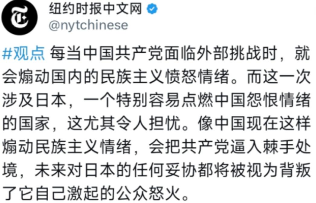 12月3日,纽约时报表示,每当中国面临外部挑战时,就会煽动国内民族的情绪,而这一次涉及日本,一个特别容易点燃中国怨恨情绪的国家,这尤其令人担忧,未来对日本的任何妥协都将被视为背叛。 《纽约时报》这是揣着明白装糊涂,拿历史伤痛当炒作点,用双重标准给中国扣帽子! 我认为《纽约时报》睁着眼说瞎话,无良报纸,如果日本在美国屠杀三千万之多,《纽约时报》难道就欢天喜地了吗? 先掰扯清楚,中国人对日本的复杂情绪,从来不是什么“被煽动”的结果,而是刻在民族记忆里的血泪沉淀。 从1894年旅顺大屠杀中仅存的36个幸存者,到1937年南京城里被集体射杀、焚尸灭迹的30万同胞,再到被731部队当作活体实验对象的无辜百姓,日本军国主义留下的伤痕可不是几张报纸就能抹平的。 这些不是遥远的传说,是有据可查的历史事实,是无数家庭的破碎与哀嚎,就像犹太人永远不会忘记纳粹的集中营,中国人也不可能对这些伤痛视而不见,这种情绪根本不需要任何人刻意引导,是历史本身留下的本能反应。 再说所谓的“外部挑战”,《纽约时报》怎么不提日本右翼近些年的小动作?一边否认“慰安妇”制度,一边修改历史教科书淡化侵略罪行,甚至有政客公然喊出“台湾有事就是日本有事”的危险言论,这不是在触碰中国的底线是什么? 中国人的愤怒,从来不是无缘无故的情绪宣泄,而是对现实挑衅的正常回应,就像有人总在你伤口上撒盐,你还能笑脸相迎吗? 《纽约时报》在报道其他国家时可不是这副模样,当年智利发生示威活动,明明伤亡人数更多,却被他们骂作“暴乱分子”,而香港的暴力示威者却被美化为“民主勇士”,这种双重标准玩得可真溜。 更可笑的是说“对日本的任何妥协都将被视为背叛”,这纯粹是在制造对立,中国人向来是恩怨分明,我们反对的是日本的军国主义复活,不是普通日本民众,更不是要永远抱着仇恨不放。 这些年中日在经贸、文化等领域的合作一直没断,民间交流也从未停止,这难道不是最好的证明?真正让人担忧的,是《纽约时报》这种不负责任的报道,故意放大矛盾、挑动对立,完全背离了媒体应有的客观公正。 他们怎么不想想,如果自己国家遭遇那样的侵略,人民遭受那样的苦难,他们还能轻飘飘地说别人“煽动情绪”吗? 看看历史上的例子,日军在二战期间不仅侵略中国,在东南亚也制造了马尼拉惨案,杀害了十万菲律宾平民,对美国战俘更是实施了惨无人道的“巴丹死亡行军”。 这些都是铁一般的事实,《纽约时报》却选择性失明,反而来指责中国,这种只看立场不顾事实的报道,与其说是新闻,不如说是别有用心的政治宣传。 文章只是个人看法,不代表任何立场,大家觉得《纽约时报》的报道是否客观?中国人对日本的情绪真的是被煽动的吗?欢迎在评论区留下你的观点,一起理性探讨。