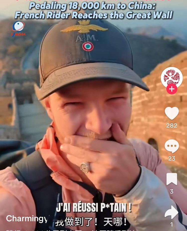 “妈妈,我做到了”法国小伙在长城上哽咽落泪,从法国到中国骑行18000公里,穿越了30多个国家,终于到达了长城,这个他梦寐以求的地方。为了自己的梦想他整整骑行了三年的时间,这种实现梦想的激动之情溢于言表