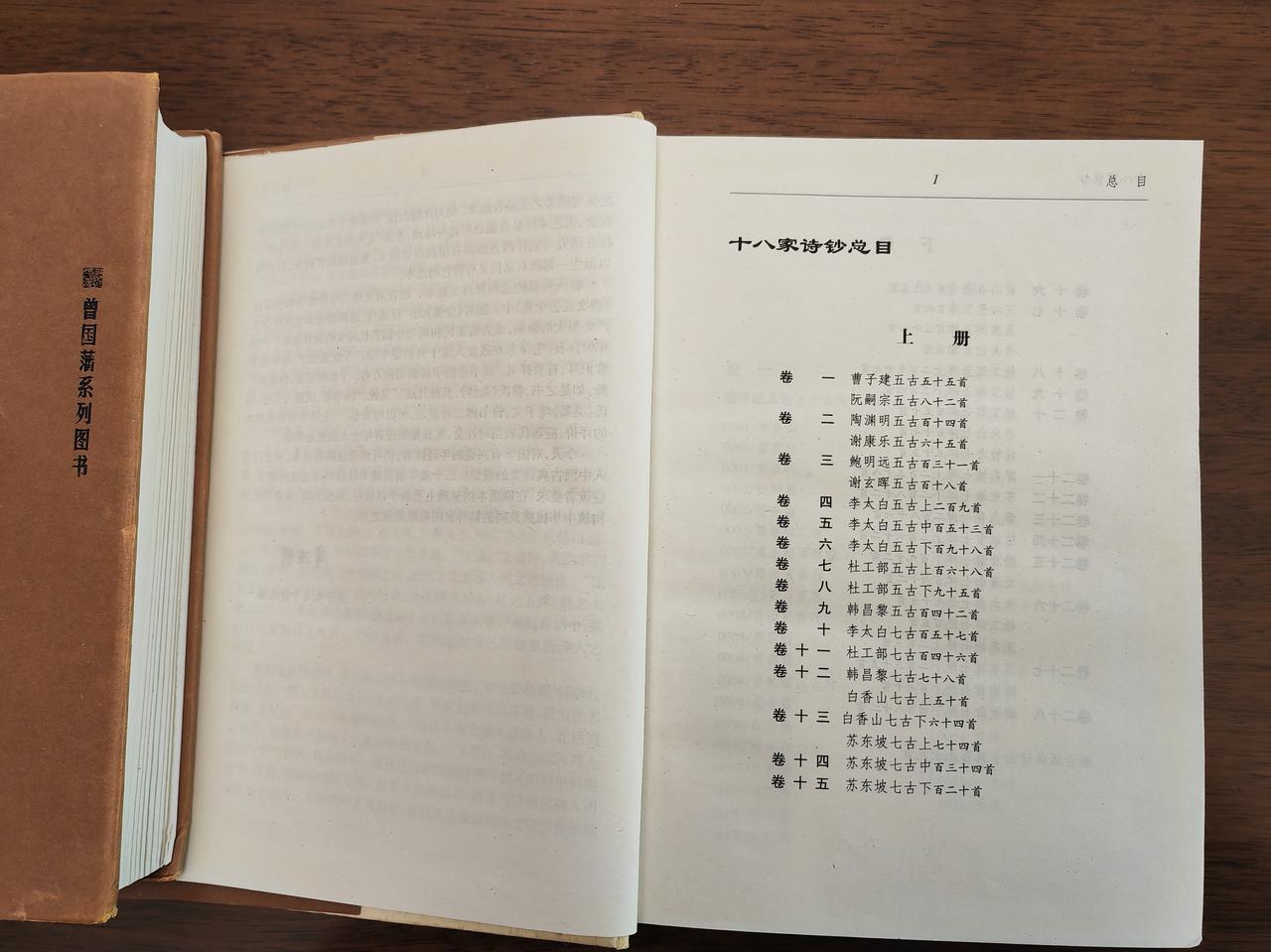 钱钟书最开始习诗,作为学习资料的就是这套《十八家诗钞》。曾国藩编了两套有名的书,一是《经史百家杂钞》,另就是《十八家诗钞》。古人学习,多是诗文两种,曾国藩编辑之旨也在此,便是通过诗歌精选与文章精选,给自己或他人作范本,学习提高之用。十八家者,收从魏晋到元代曹植、阮籍、陶渊明、谢灵运、鲍照、谢朓、李白、杜甫、韩愈、白居易、苏轼、黄庭坚、王维、孟浩然、李商隐、杜牧、陆游、元好问等十八位诗人的古近体诗六千多首。钱钟书读元好问七律评价说:“遗山七律,声调茂越,气色苍浑。”