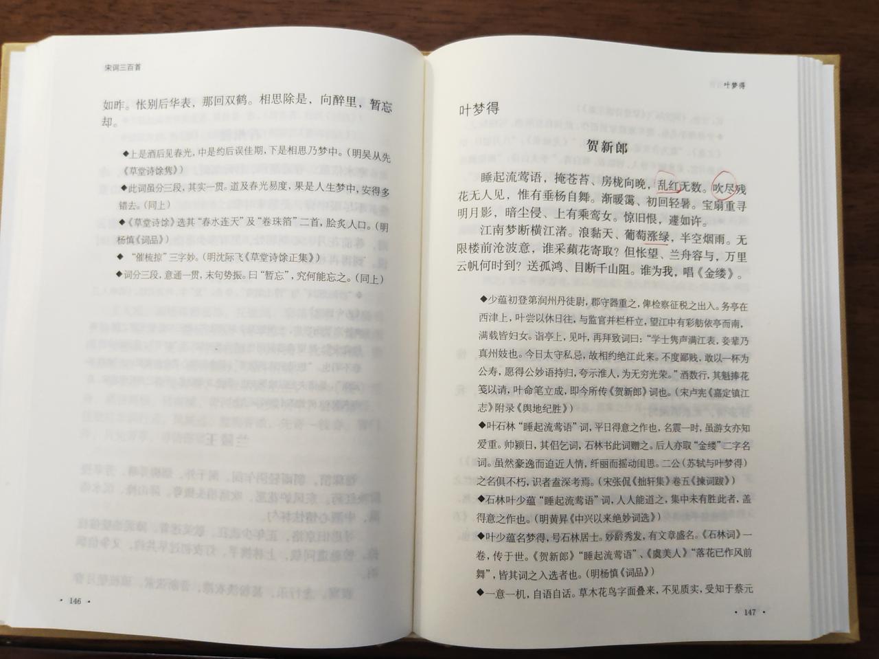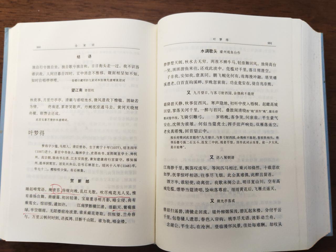 宋代词人叶梦得的成名作《贺新郎•睡起流莺语》一词,查阅当时的笔记,历代词选,奇怪,所有书里的所记录的同一首词,没有真正一模一样,完全相同的,不是字,就是词,甚至句。 我罗列了七个版本,如下: 版本一:宋洪迈《夷坚丁志》卷十二:“睡起闻莺语。点苍苔、帘栊昼掩,乱红无数。吹尽残花无人见,唯有垂杨自舞。渐暖蔼,初回轻暑。宝扇重寻明月影,暗尘侵。尚有乘鸾女,惊旧恨,镇如许。 江南梦断横江渚。浪黏天,蒲陶涨渌,半空烟雨。无限楼前沧波意,谁采𬞟花寄取?但怅望,兰舟容与。万里云帆何时到?送孤鸿,目断千山阻。重为我,唱金缕。” 版本二:宋黄昇《花庵词选》:“睡起流莺语。掩苍苔、房栊向晓,乱红无数。飞尽残花无人见,惟有垂杨自舞。渐暖霭、初回轻暑。宝扇重寻明月影,暗尘侵、尚有乘鸾女。惊旧恨,镇如许。 江南梦断蘅皋渚。浪黏天、蒲萄涨绿,半空烟雨。无限楼前沧波意,谁采𬞟花寄取。但怅望、兰舟容与。万里云帆何时到,送孤鸿、目断千山阻。谁为我,唱金缕。” 版本三:清朱彝尊《词综》:“睡起啼莺语。掩苍苔房栊向晚,乱红无数。吹尽残花无人见,惟有垂杨自舞。渐暖霭初回轻暑。宝扇重寻明月影,暗尘侵,上有乘鸾女。惊旧恨,遽如许。 江南梦断横江渚,浪黏天葡萄涨绿,半空烟雨。无限楼前沧波意,谁采𬞟花寄取?但怅望兰舟容与。万里云帆何时到?送孤鸿目断千山阻。谁为我,唱《金缕》?” 版本四:清朱祖谋《宋词三百首》:“睡起流莺语,掩苍苔、房栊向晚,乱红无数。吹尽残花无人见,惟有垂杨自舞。渐暖霭、初回轻暑。宝扇重寻明月影,暗尘侵、上有乘鸾女。惊旧恨,遽如许。 江南梦断横江渚。浪黏天、葡萄涨绿,半空烟雨。无限楼前沧波意,谁采𬞟花寄取?但怅望、兰舟容与,万里云帆何时到?送孤鸿、目断千山阻。谁为我,唱《金缕》?” 版本五:俞陛云在《唐五代两宋词选释》(即《北宋词境浅说》):“睡起流莺语。掩苍苔、房栊向晓,乱红无数。吹尽残花无人见,惟有垂杨自舞。渐暖霭、初回轻暑。宝扇重寻明月影,暗尘侵、上有乘鸾女。惊旧恨,镇如许。 江南梦断蘅皋渚。浪黏天、葡萄涨绿,半空烟雨。无限楼前沧波意,谁采𬞟花寄取。但怅望、兰舟容与。万里云帆何时到,送孤鸿、目断千山阻。谁为我,唱金缕。” 版本六:唐圭璋《全宋词》:“睡起啼莺语。掩青苔、房栊向晚,乱红无数。吹尽残花无人见,惟有垂杨自舞。渐暖霭、初回轻暑。宝扇重寻明月影,暗尘侵、尚有乘鸾女。惊旧恨,遽如许。 江南梦断横江渚。浪黏天、葡萄涨绿,半空烟雨。无限楼前沧波意,谁采𬞟花寄取。但怅望、兰舟容与。万里云帆何时到,送孤鸿、目断千山阻。谁为我,唱金缕。” 版本七:汪中《新译宋词三百首》:“睡起流莺语。掩苍苔、房栊向晚,乱红无数。吹尽残花无人见,惟有垂杨自舞。渐暖霭、初回轻暑。宝扇重寻明月影,暗尘侵、上有乘鸾女。惊旧恨,遽如许。 江南梦断横江渚。浪黏天、葡萄涨绿,半空烟雨。无限楼前沧波意,谁采𬞟花寄取?但怅望、兰舟容与。万里云帆何时到?送孤鸿、目断千山阻。谁为我,唱《金缕》?” 稍微罗列一下不同: 1、睡起流莺语,有的为闻莺语,有的为啼莺语; 2、掩苍苔、房栊向晚,有的为掩青苔,有的为房栊向晓; 3、江南梦断蘅皋渚,有的为江南梦断横江渚,其实两者很有些场景上的不同了; 4、暗尘侵、上有乘鸾女,有的为尚有乘鸾女; 5、惊旧恨,遽如许,有的为镇如许; 6、浪黏天、葡萄涨绿,有的为蒲萄。