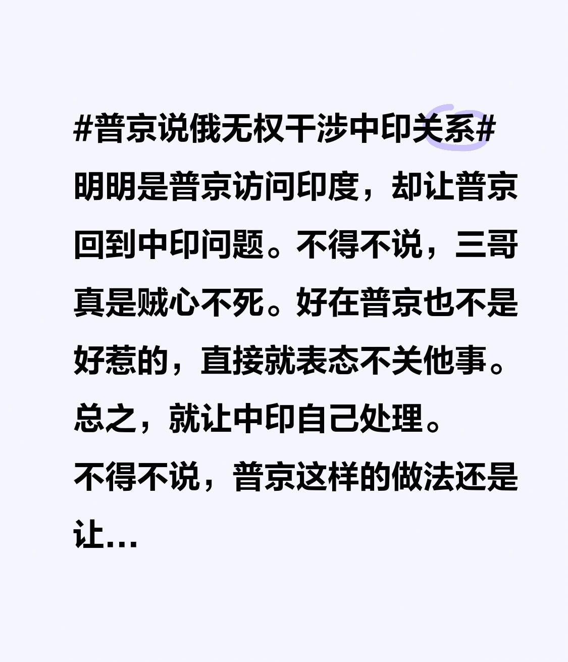 好在普京也不是好惹的,直接就表态不关他事。总之,就让中印自己处理。 不得不说,普京这样的做法还是让三哥比较难堪的。为什么?因为三哥之所以会提中印关系,主要还是想让俄罗斯帮忙撑撑场子。 谁曾想普京并没有惯着三哥,直接打脸三哥让三哥难堪。真是笑死人了!如何看待莫迪隆重接待普京 莫迪以最高礼遇接待普京你怎么看 印度和俄罗斯的关系会如何发展 普京时隔四年再访印度你怎么看