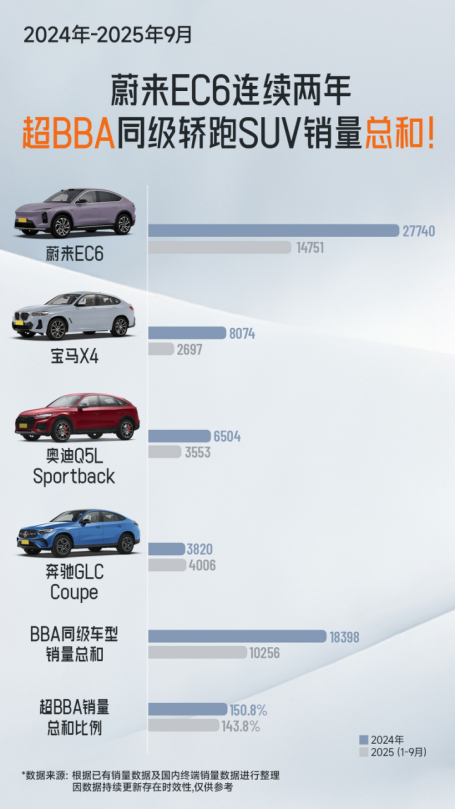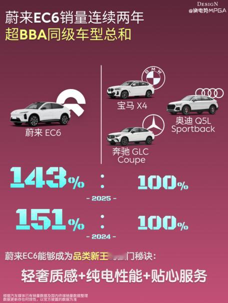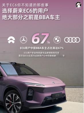 轿跑SUV,我感觉已经彻底成了蔚来自己的“绝对领域”!前有古人,已经击垮;后无来者,嗯是真的没有来者。其实轿跑SUV吧是豪华品牌必争之地,BBA哪家都没落下,X4、GLC Coupe、Q5L Sportback,这三台车对于品牌来说,一直是赔本赚吆喝的,除了能尽可能拉一拉GLC和Q5L的调性以外,几乎没什么实际作用(销量微乎其微,路上看到都觉得很稀奇)所以这个领域,真的没什么新势力跟进,很多人都担心“BBA都不行,我们岂不是更不行”?唯独蔚来,是不信邪的,EC6就是奔着这个小众赛道来的。实话说EC6的销量跟普通SUV比肯定是没那么高的,比ES6还要少一些。但是EC6的车主,很大程度都是年轻的前BBA车主,对品牌调性对车辆的情绪价值有着一定的追求。回过头来看看EC6所取得的各种成绩,我也觉得不是很夸张,的确BBA都没做到的事情,人家蔚来做到了。而且除了蔚来,也没有什么友军结伴而行。虽然小众,但是成绩可并不小众。往大了说,这是击败了BBA;往小了说,这是拿下了一个单一赛道。无论怎么说,我觉得EC6的这个成绩,是真的很强!汽场全开蔚来蔚来EC6
