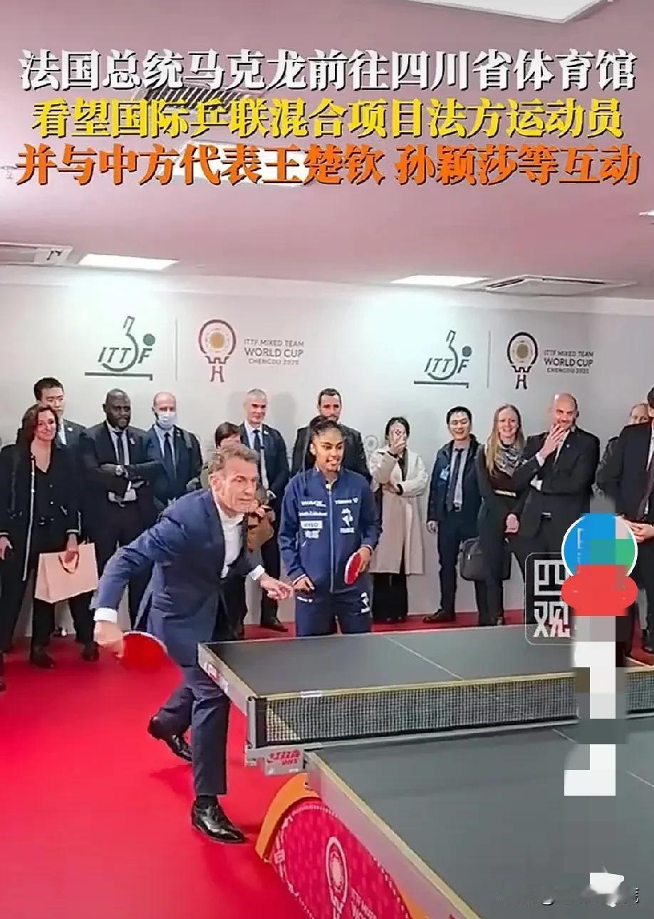 我能接受马克龙在成都公园晨跑 也能接受他去了四川大学 但我不能接受的是 他竟然跟王楚钦,孙颖莎打球啦! 我的偶像大头和莎莎,我连真人都没亲眼见过[笑哭],马克龙居然能和他们打球,我真是,现场照片看的我都羡慕哭了。 听说马克龙还一直喊“Sha Sha”,还专门要和莎莎互动,莎莎和王楚钦故意放水,温柔喂球,打了场气氛欢乐的友谊赛。 哎,马克龙这待遇,我酸了。 他和我的偶像们欢乐打球,而我只能在屏幕的另一端,默默保存现场图喽。 哎,今天真是羡慕法国总统的一天。[不看]