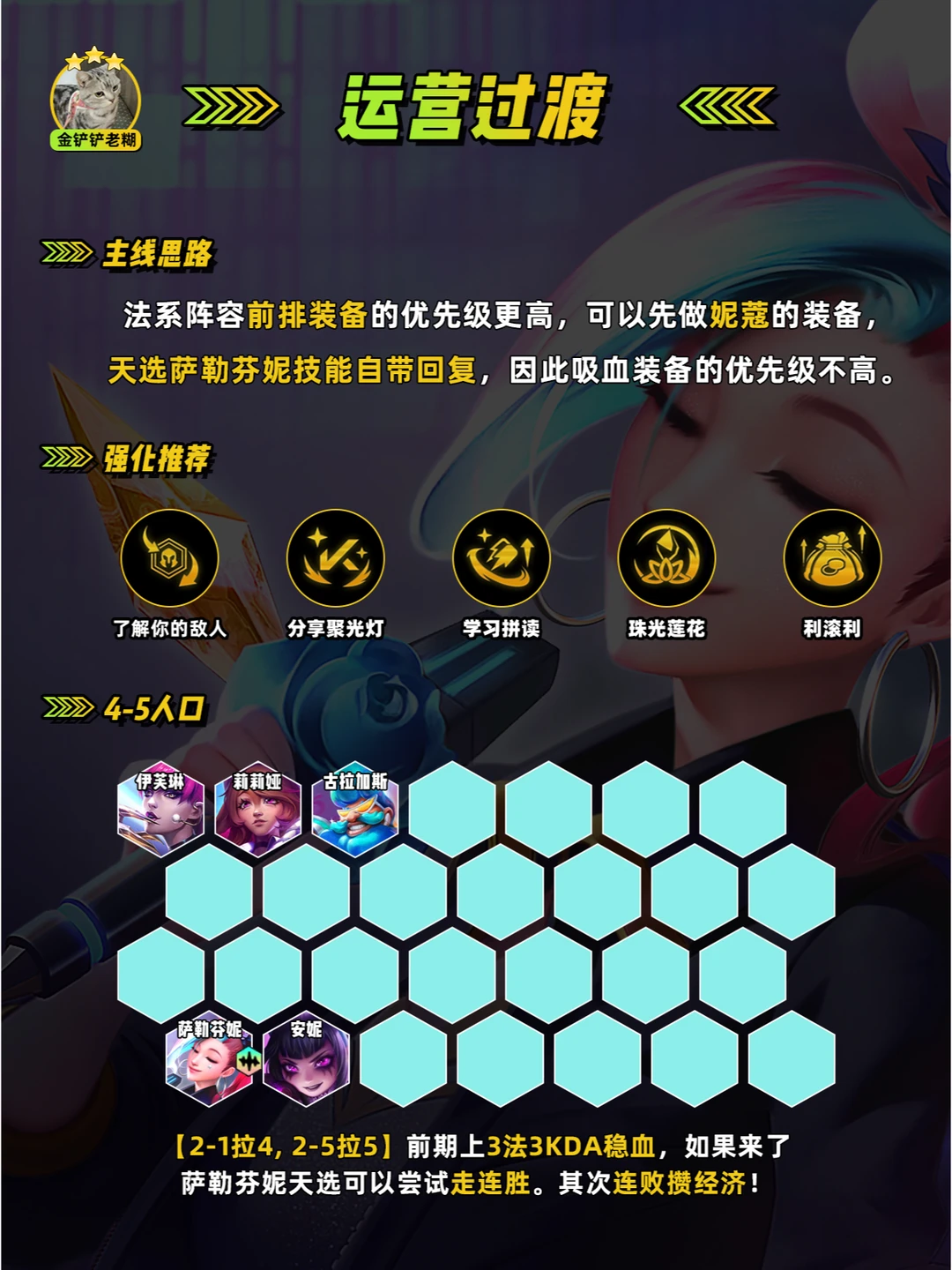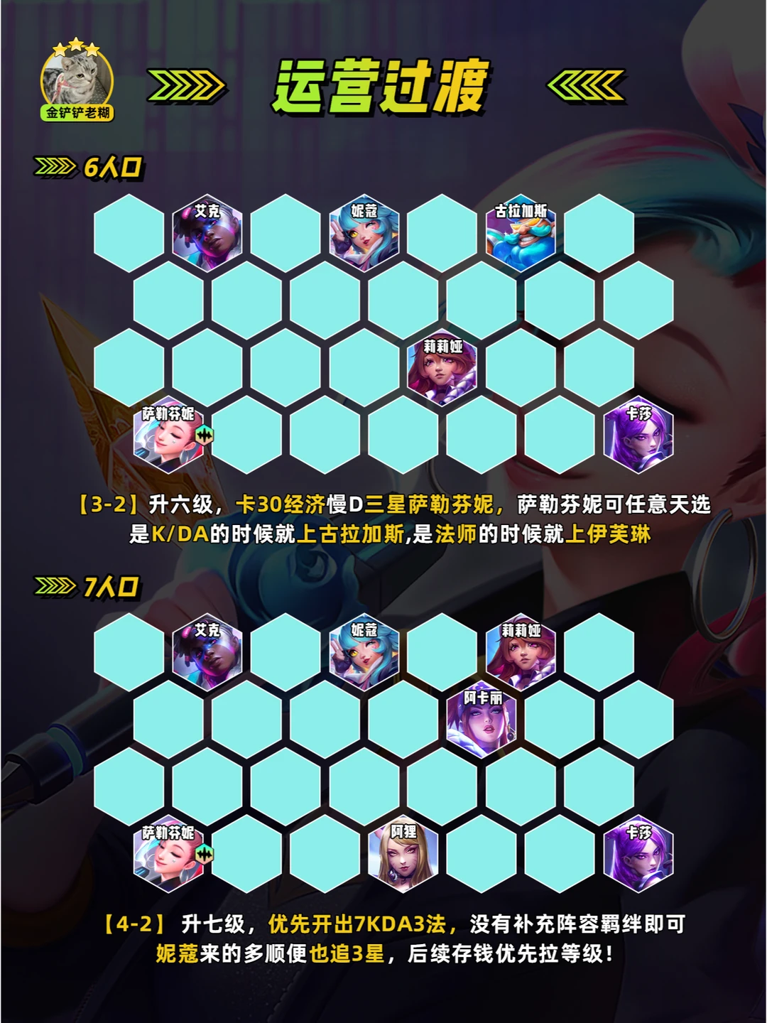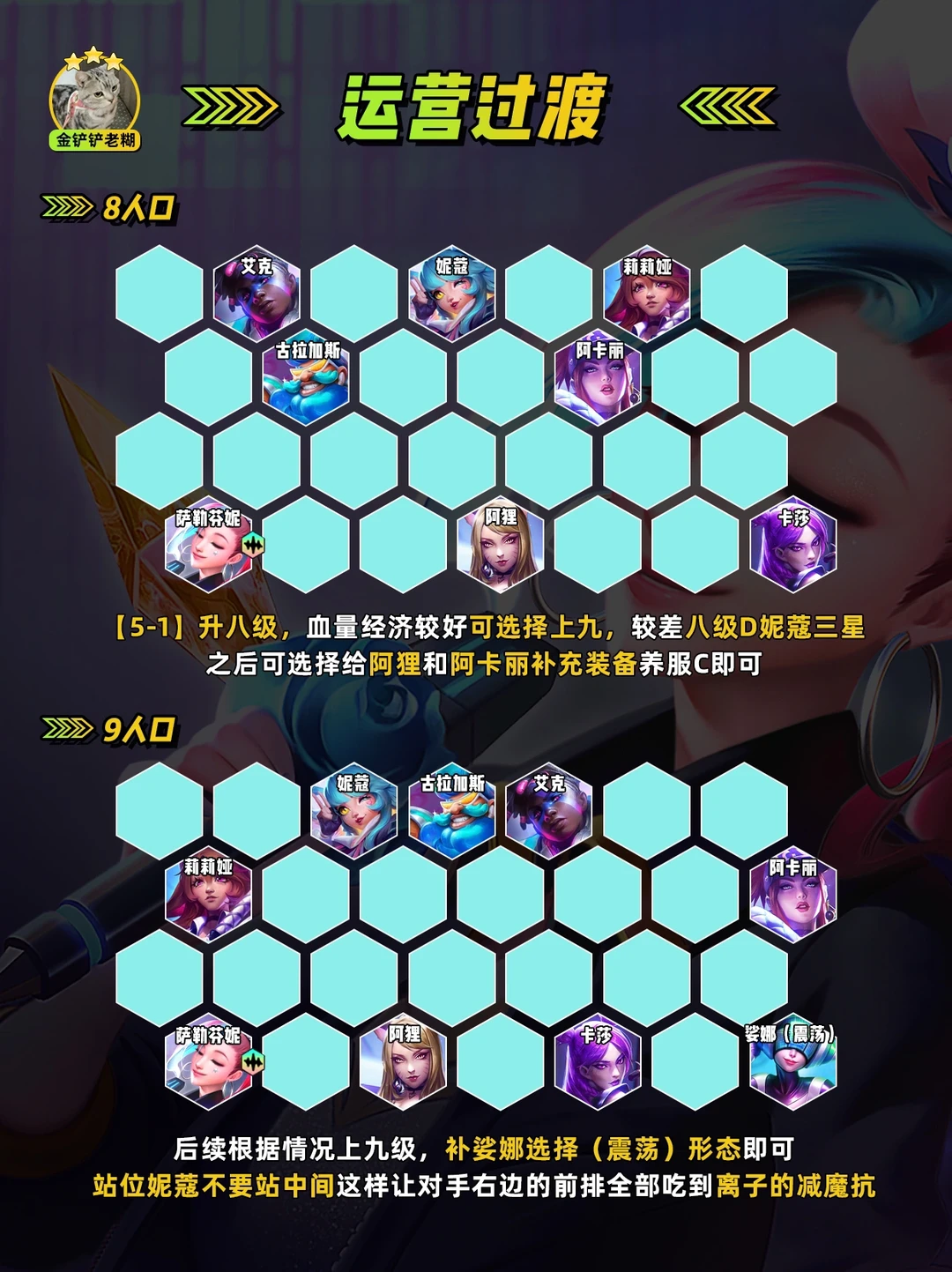 前期正常2-1拉4,2-5拉5,不搜卡; 3-2拉6小搜,整体二星即可停手,后续可以卡30利息找三星萨勒芬妮! 4-2拉7小搜,优先开7KDA3法师,没有补充羁绊 5-1拉8人口,经济好优先上9,没有容错就在8级找三星妮蔻、艾克 后续上9人口,补娑娜(震荡)形态即可,后期养阿狸和阿卡丽双C