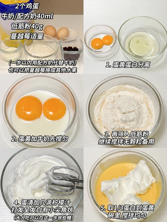 2鸡蛋|牛奶/配方奶40ml|低筋粉40g|蔓越莓适量
