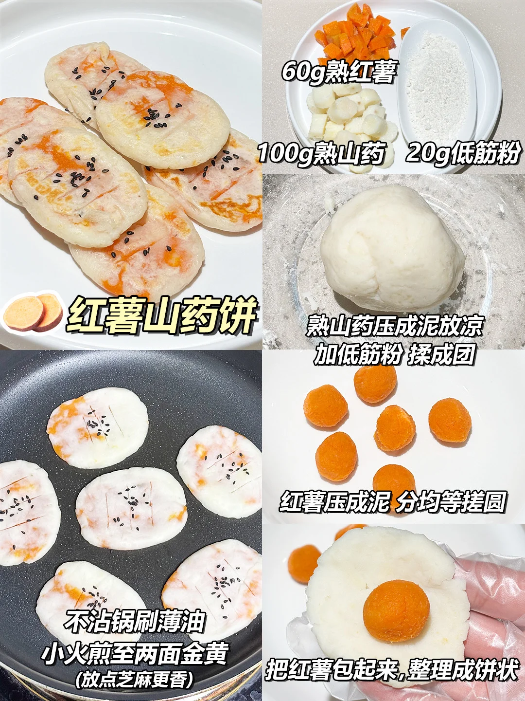 ▪步骤:熟山药压成泥放凉,加低筋粉 揉成团,红薯压成泥 分均等搓圆,把红薯包起来,整理成饼状,平底锅刷油小火煎 两面金黄就好!